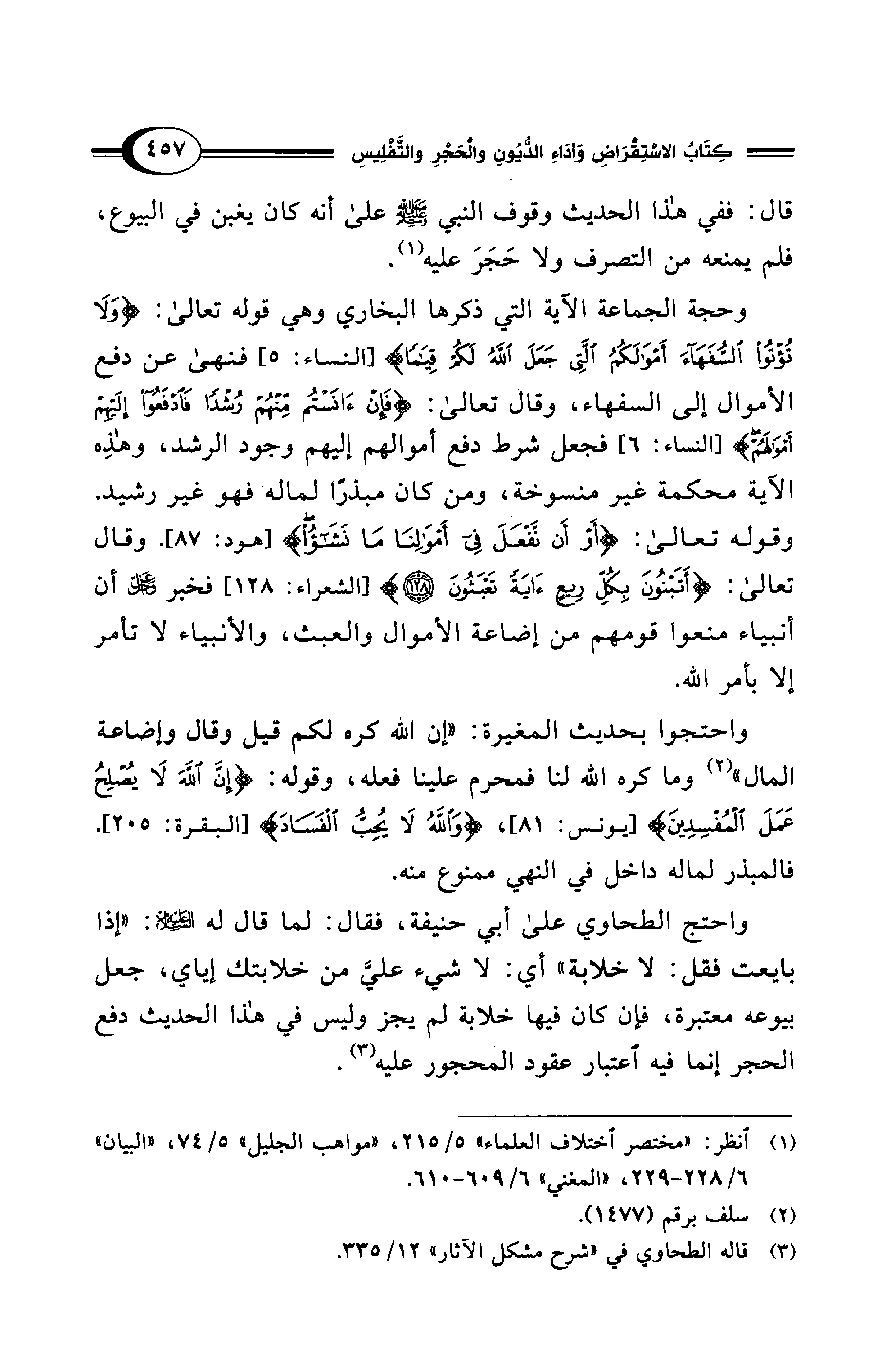 وحجة الجماعة الآية التي ذكرها البخاري وهي قوله تعالى: {وَلَا تُؤْتُوا السُّفَهَاءَ أَمْوَالَكُمُ الَّتِي جَعَلَ اللهُ لَكُمْ قِيَامًا} [النساء: 5] فنهى عن دفع الأموال إلى السفهاء، وقال تعالى: {فَإِنْ آنَسْتُمْ مِنْهُمْ رُشْدًا فَادْفَعُوا إِلَيْهِمْ أَمْوَالَهُمْ} [النساء: 6] فجعل شرط دفع أموالهم إليهم وجود الرشد، وهذِه الآية محكمة غير منسوخة، ومن كان مبذرًا لماله فهو غير رشيد. وقوله تعالى: {أَوْ أَنْ نَفْعَلَ فِي أَمْوَالِنَا مَا نَشَاءُ} [هود: 87]. وقال تعالى: {أَتَبْنُونَ بِكُلِّ رِيعٍ آيَةً تَعْبَثُونَ (128)} [الشعراء: 128] فخبر -عز وجل- أن أنبياء منعوا قومهم من إضاعة الأموال والعبث، والأنبياء لا تأمر إلا بأمر الله.