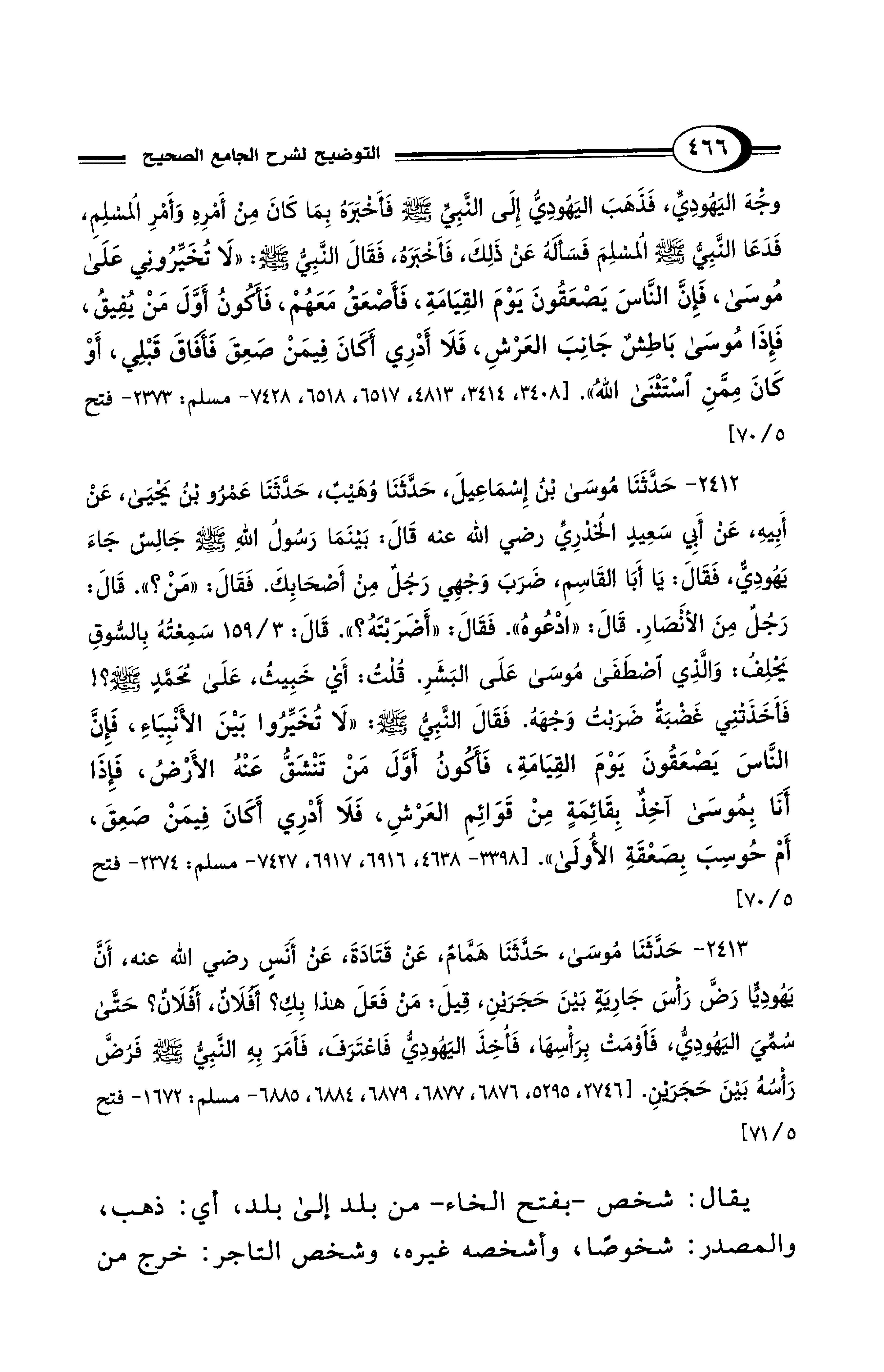 2412 - حَدَّثَنَا مُوسَى بْنُ إِسْمَاعِيلَ، حَدَّثَنَا وُهَيْبٌ، حَدَّثَنَا عَمْرُو بْنُ يَحْيَى، عَنْ أَبِيهِ، عَنْ أَبِي سَعِيدٍ الخُدْرِيِّ رضي الله عنه قَالَ: بَيْنَمَا رَسُولُ اللهِ - صلى الله عليه وسلم - جَالِسٌ جَاءَ يَهُودِيٌّ، فَقَالَ يَا أَبَا القَاسِمِ، ضَرَبَ وَجْهِي رَجُلٌ مِنْ أَصْحَابِكَ. فَقَالَ: "مَنْ؟ ". قَالَ: رَجُلٌ مِنَ الأَنْصَارِ. قَالَ: "ادْعُوهُ". فَقَالَ: "أَضَرَبْتَهُ؟ ". قَالَ: 3/ 159 سَمِعْتُهُ بِالسُّوقِ يَحْلِفُ: وَالَّذِي اصْطَفَى مُوسَى عَلَى البَشَرِ. قُلْتُ: أَيْ خَبِيثُ، عَلَى مُحَمَّدٍ - صلى الله عليه وسلم -؟! فَأَخَذَتْنِي غَضْبَةٌ ضَرَبْتُ وَجْهَهُ. فَقَالَ النَّبِيُّ - صلى الله عليه وسلم -: "لَا تُخَيِّرُوا بَيْنَ الأَنْبِيَاءِ، فَإِنَّ النَّاسَ يَصْعَقُونَ يَوْمَ القِيَامَةِ، فَأَكُونُ أَوَّلَ مَنْ تَنْشَقُّ عَنْهُ الأَرْضُ، فَإِذَا أَنَا بِمُوسَى آخِذٌ بِقَائِمَةٍ مِنْ قَوَائِمِ العَرْشِ، فَلاَ أَدْرِي أَكَانَ فِيمَنْ صَعِقَ، أَمْ حُوسِبَ بِصَعْقَةِ الأُولَى". [3398 - 4638، 6916، 6917، 7427 - مسلم: 2374 - فتح 5/ 70]