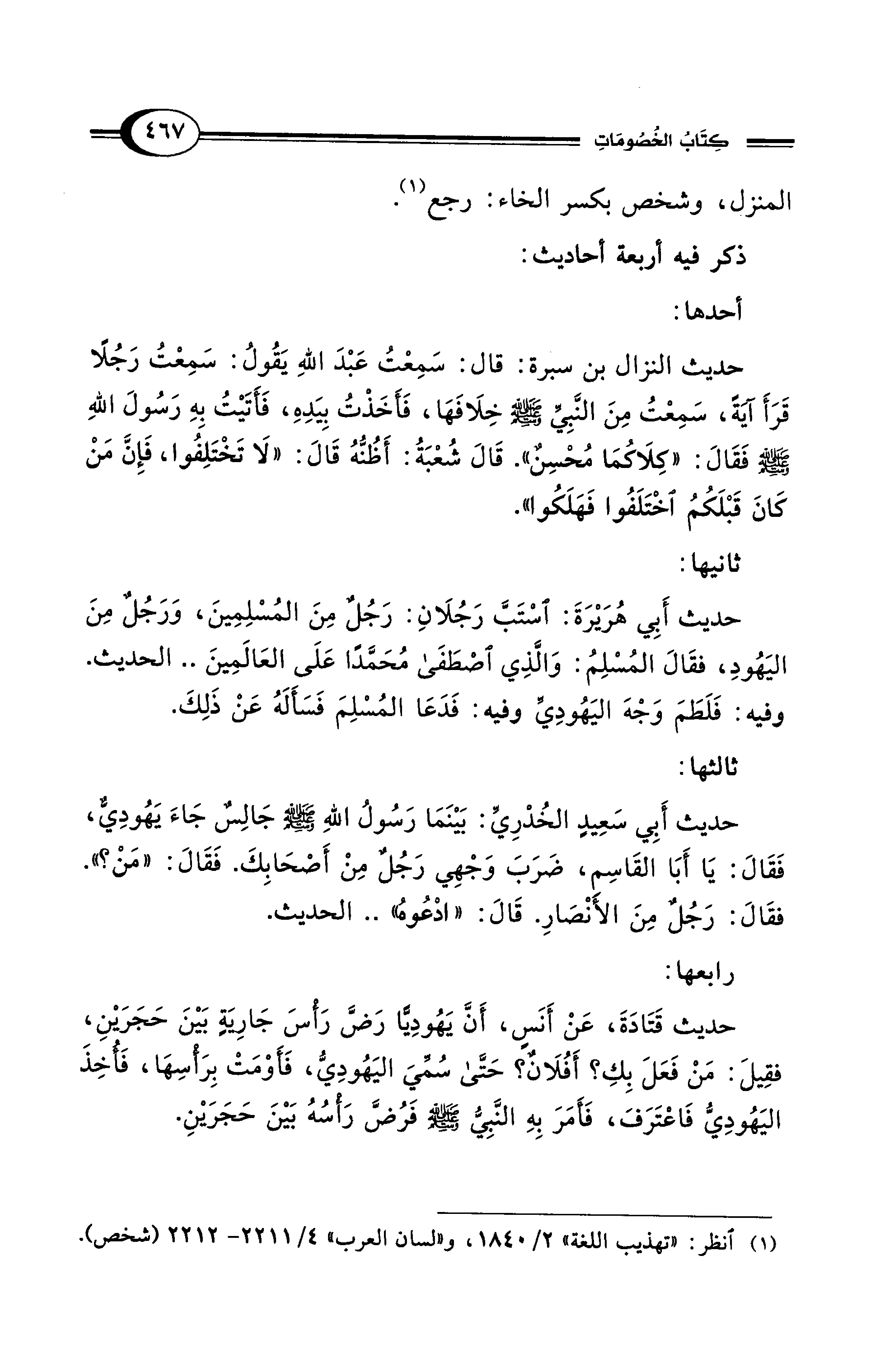 حديث أَبِي هُرَيْرَةَ: اسْتَبَّ رَجُلَانِ: رَجُلٌ مِنَ المُسْلِمِينَ، وَرَجُل مِنَ اليَهُودِ، فقَالَ المُسْلِمُ: وَالَّذِي اصْطَفَى مُحَمَّدًا عَلَى العَالَمِينَ .. الحديث. وفيه: فَلَطَمَ وَجْهَ اليَهُودِيِّ وفيه: فَدَعَا المُسْلِمَ فَسَأَلَهُ عَنْ ذَلِكَ.