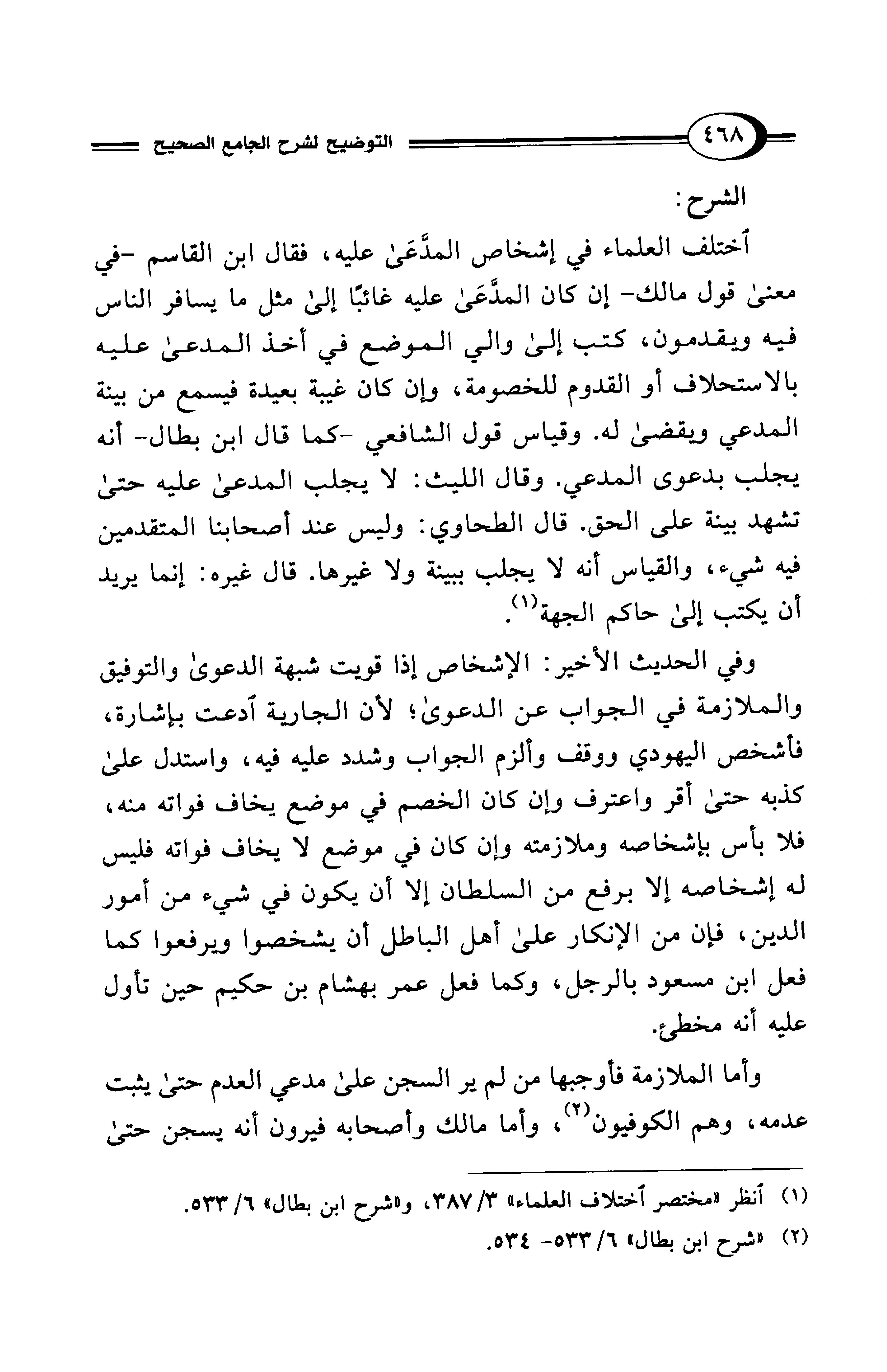 وفي الحديث الأخير: الإشخاص إذا قويت شبهة الدعوى والتوفيق والملازمة في الجواب عن الدعوى؛ لأن الجارية ادعت بإشارة، فأشخص اليهودي ووقف وألزم الجواب وشدد عليه فيه، واستدل على كذبه حتى أقر واعترف وإن كان الخصم في موضع يخاف فواته منه، فلا بأس بإشخاصه وملازمته وإن كان في موضع لا يخاف فواته فليس له إشخاصه إلا برفع من السلطان إلا أن يكون في شيء من أمور الدين، فإن من الإنكار على أهل الباطل أن يشخصوا ويرفعوا كما فعل ابن مسعود بالرجل، وكما فعل عمر بهشام بن حكيم حين تأول عليه أنه مخطئ.