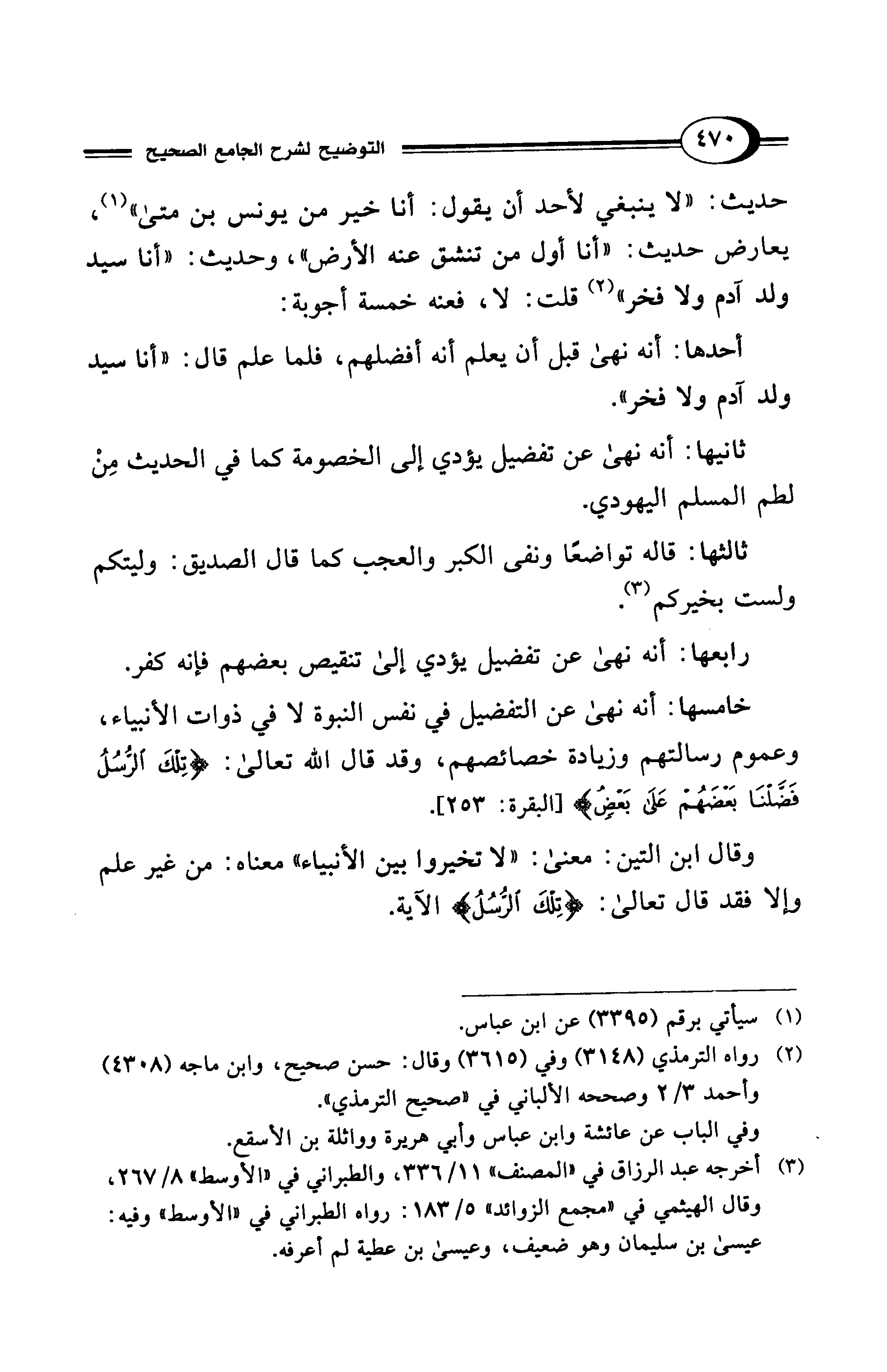 خامسها: أنه نهى عن التفضيل في نفس النبوة لا في ذوات الأنبياء، وعموم رسالتهم وزيادة خصائصهم، وقد قال الله تعالى: {تِلْكَ الرُّسُلُ فَضَّلْنَا بَعْضَهُمْ عَلَى بَعْضٍ} [البقرة: 253].