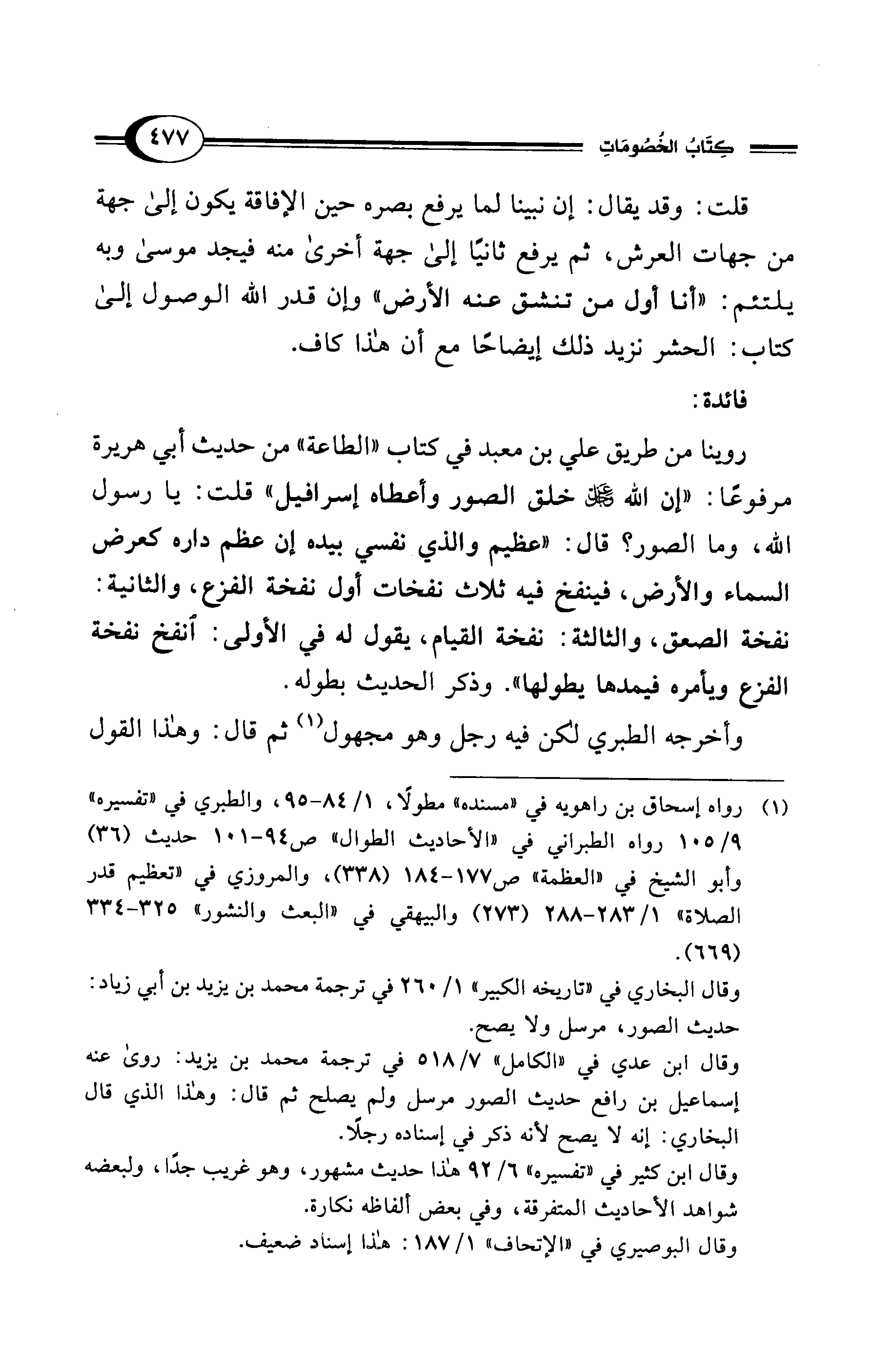 وقال: البخاري في "تاريخه الكبير" 1/ 260 في ترجمة محمد بن يزيد بن أبي زياد: حديث الصور، مرسل ولا يصح.