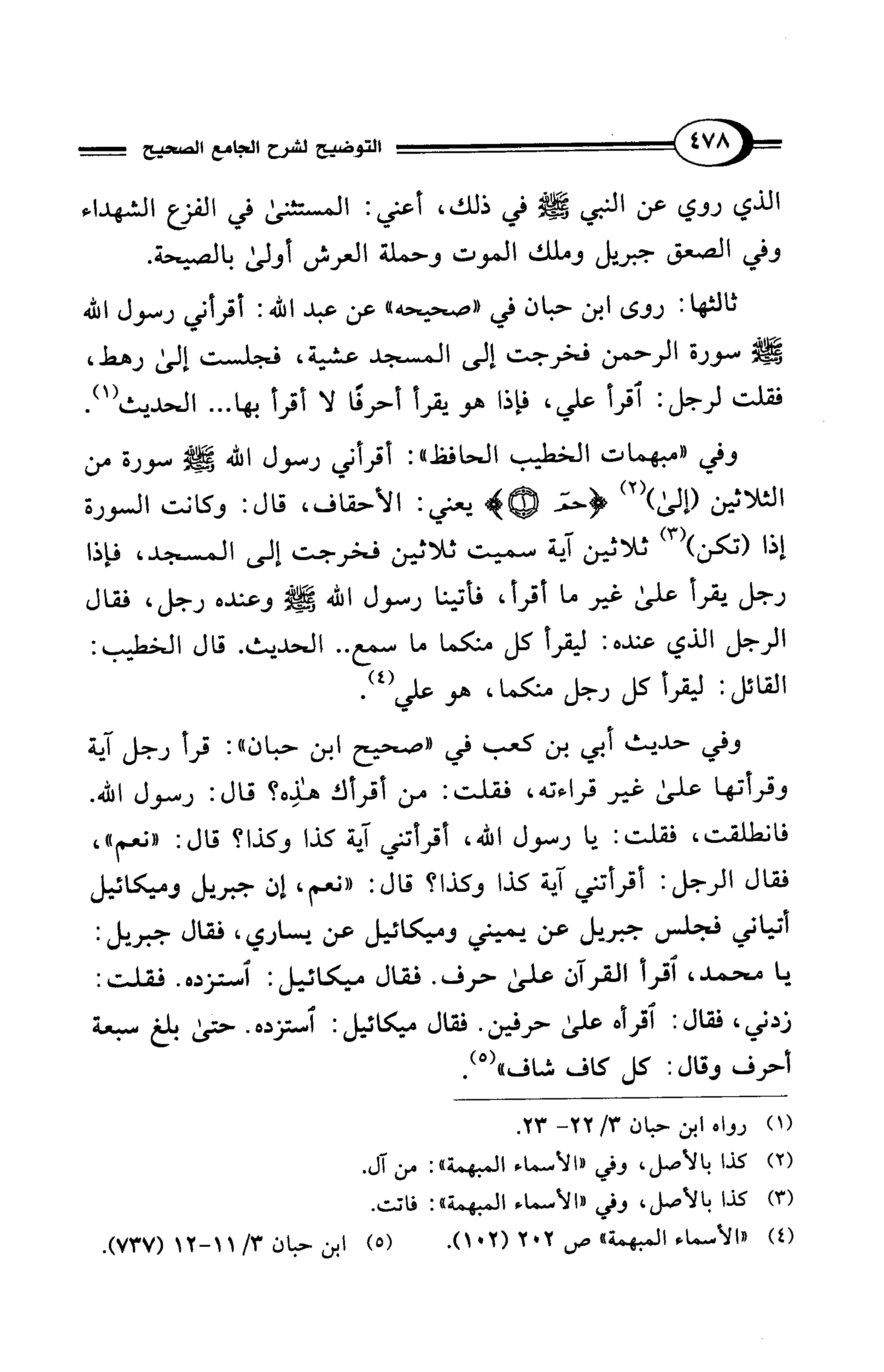 وفي حديث أبي بن كعب في "صحيح ابن حبان": قرأ رجل آية وقرأتها على غير قراءته، فقلت: من أقرأك هذِه؟ قال: رسول الله. فانطلقت، فقلت: يا رسول الله، أقرأتني آية كذا وكذا؟ قال: "نعم"، فقال الرجل: أقرأتني آية كذا وكذا؟ قال: "نعم، إن جبريل وميكائيل أتياني فجلس جبريل عن يميني وميكائيل عن يساري، فقال جبريل: يا محمد، اقرأ القرآن على حرف. فقال ميكائيل: استزده. فقلت: