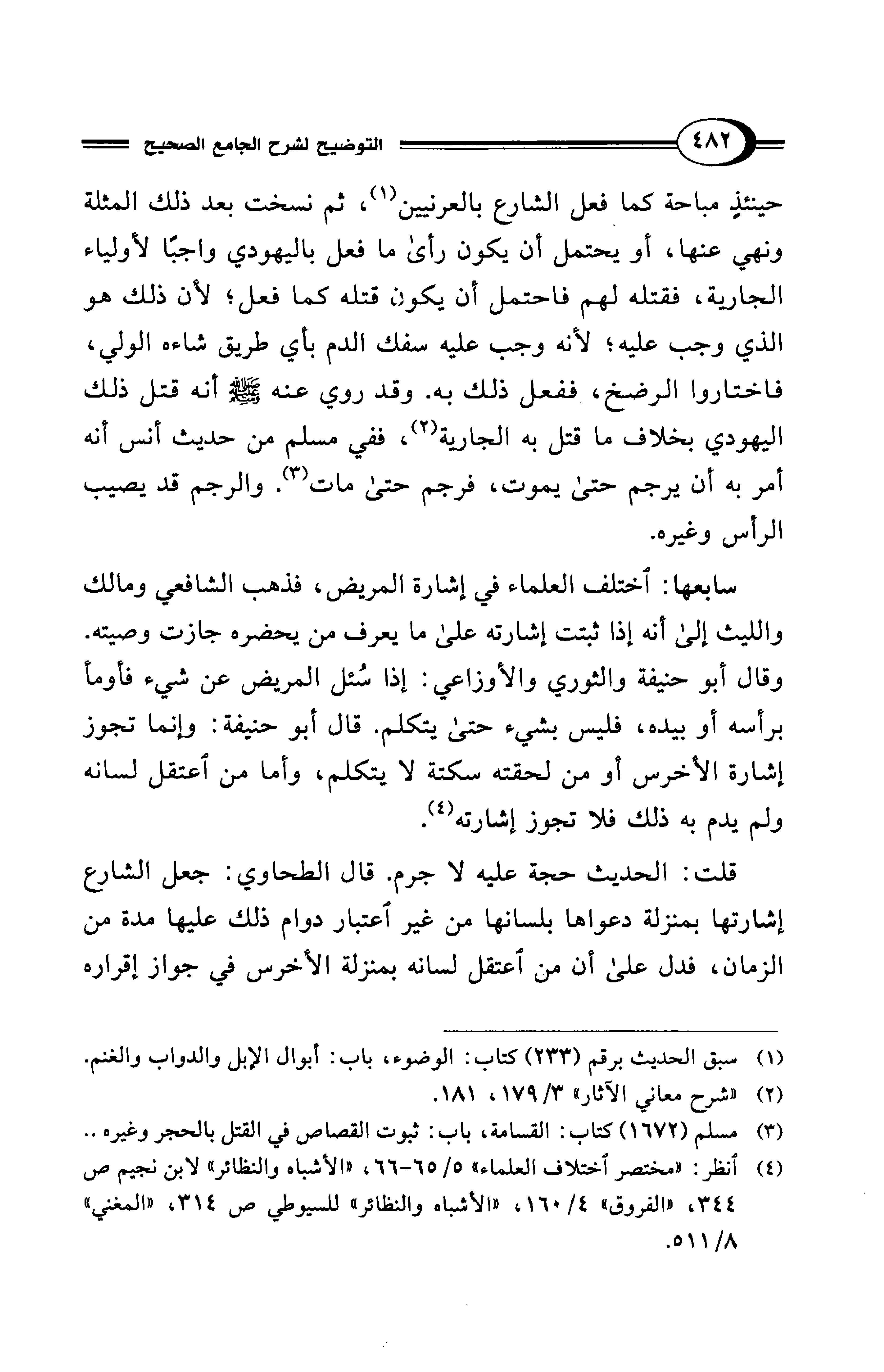 سابعها: اختلف العلماء في إشارة المريض، فذهب الشافعي ومالك والليث إلى أنه إذا ثبتت إشارته على ما يعرف من يحضره جازت وصيته. وقال أبو حنيفة والثوري والأوزاعي: إذا سُئل المريض عن شيء فأومأ برأسه أو بيده، فليس بشيء حتى يتكلم. قال أبو حنيفة: وإنما تجوز إشارة الأخرس أو من لحقته سكتة لا يتكلم، وأما من اعتقل لسانه ولم يدم به ذلك فلا تجوز إشارته (¬4).