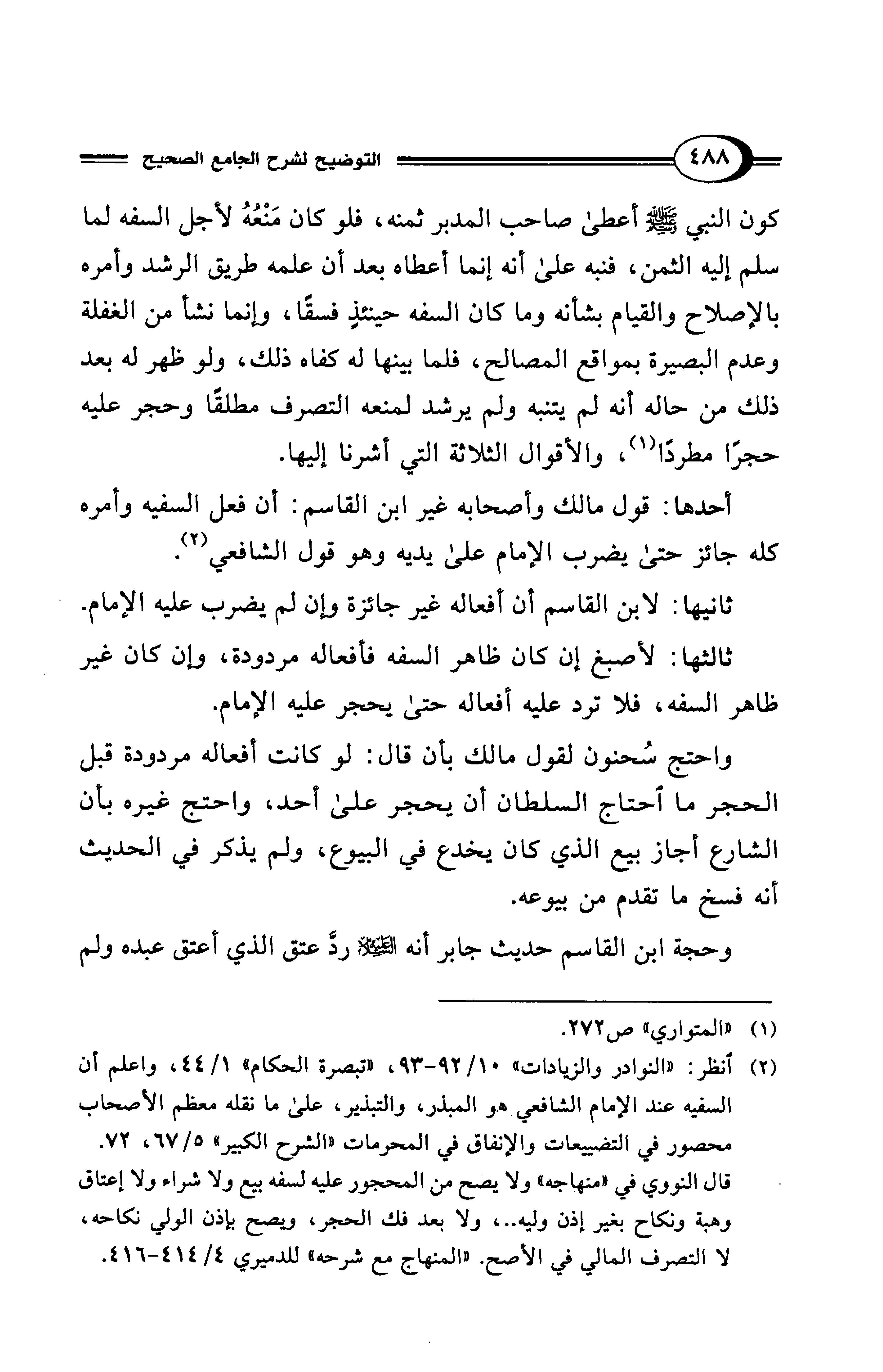 (¬2) انظر: "النوادر والزيادات" 10/ 92 - 93، "تبصرة الحكام" 1/ 44، واعلم أن السفيه عند الإمام الشافعي هو المبذر، والتبذير، على ما نقله معظم الأصحاب محصور في التضييعات والإنفاق في المحرمات "الشرح الكبير" 5/ 67، 72.