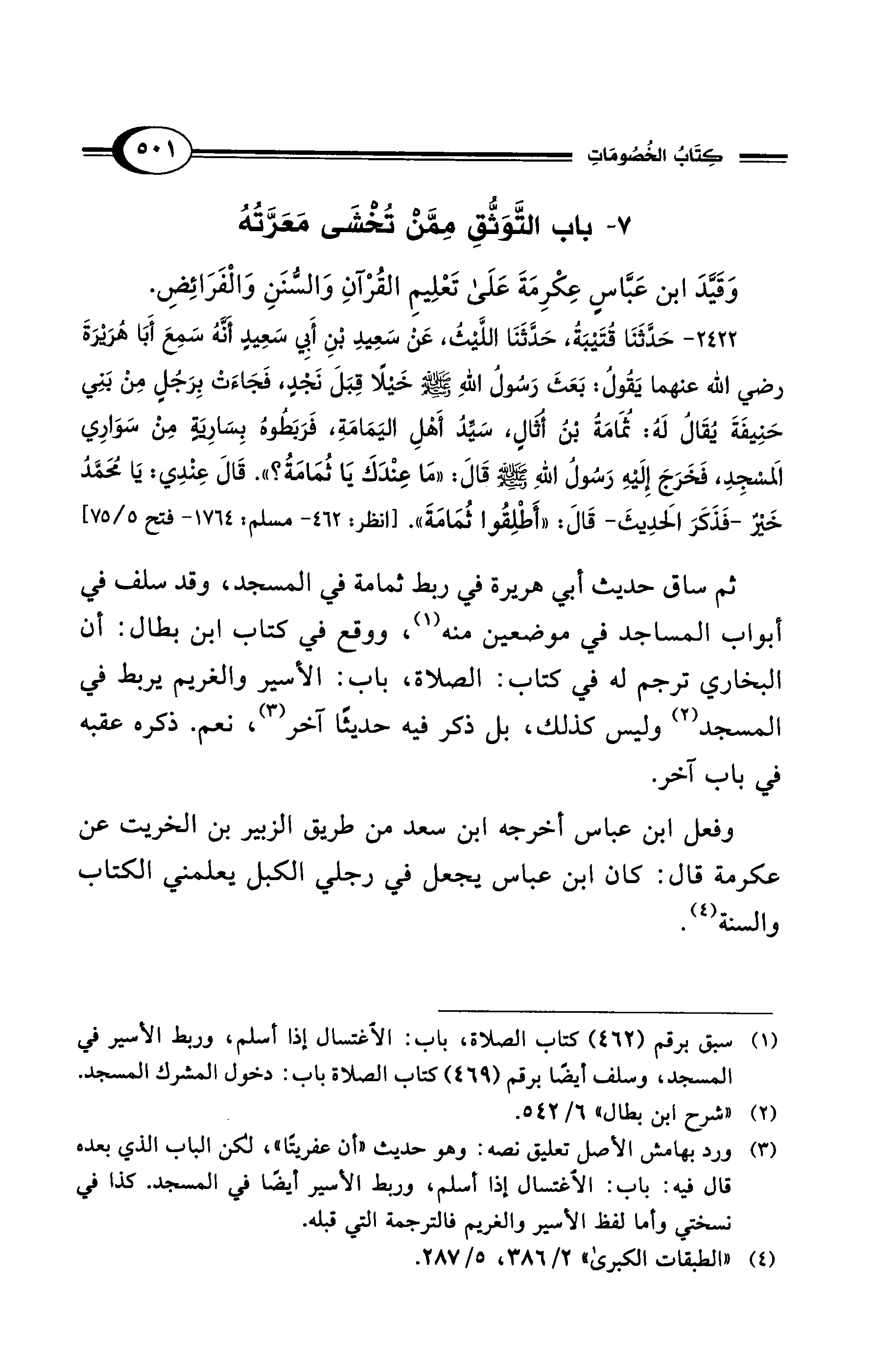 (¬3) ورد بهامش الأصل تعليق نصه: وهو حديث "أن عفريتًا"، لكن الباب الذي بعده قال فيه: باب: الاغتسال إذا أسلم، وربط الأسير أيضًا في المسجد. كذا في نسختي وأما لفظ الأسير والغريم فالترجمة التي قبله.