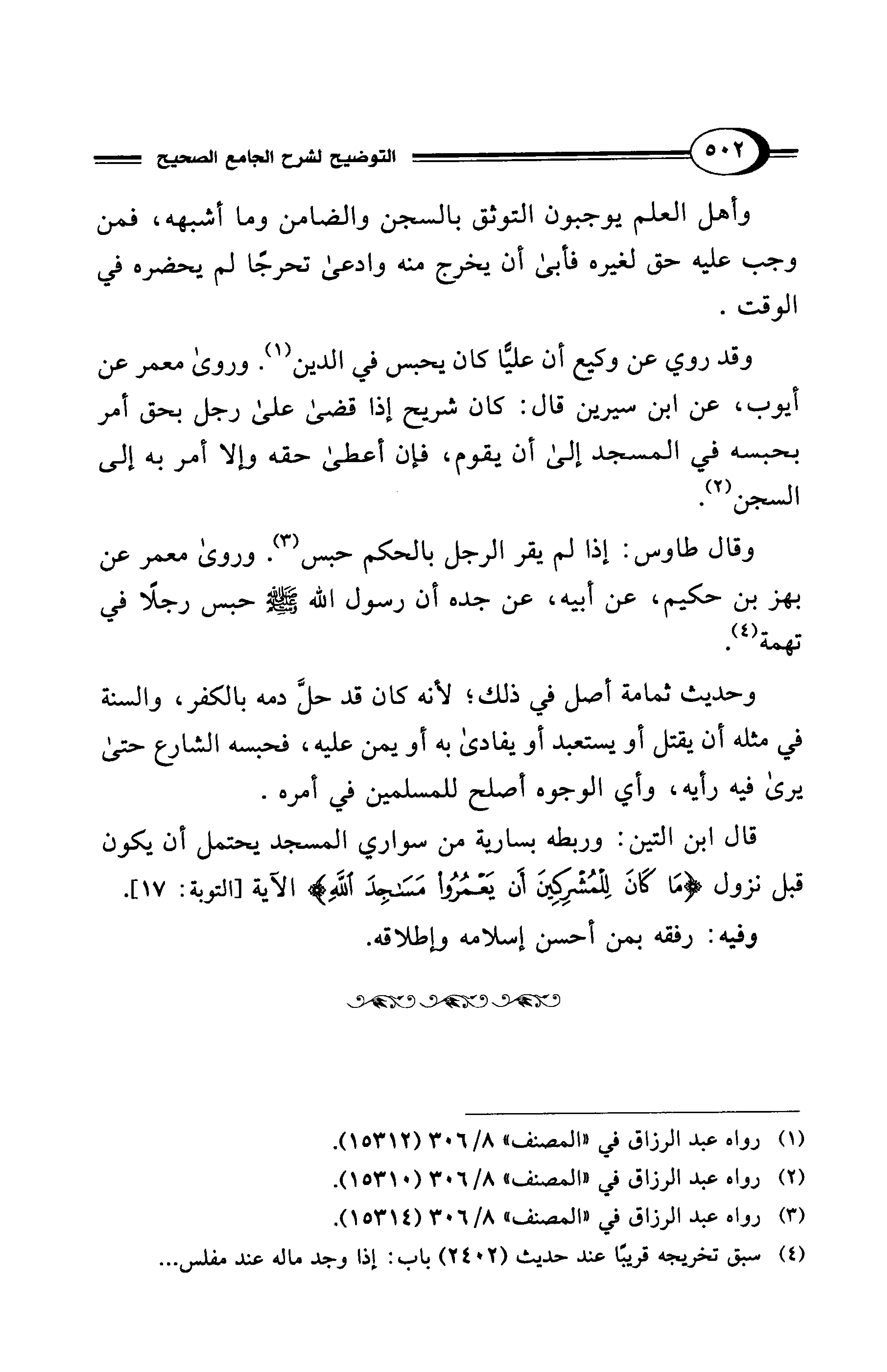 قال ابن التين: وربطه بسارية من سواري المسجد يحتمل أن يكون قبل نزول {مَا كَانَ لِلْمُشْرِكِينَ أَنْ يَعْمُرُوا مَسَاجِدَ اللهِ} الآية [التوبة: 17].