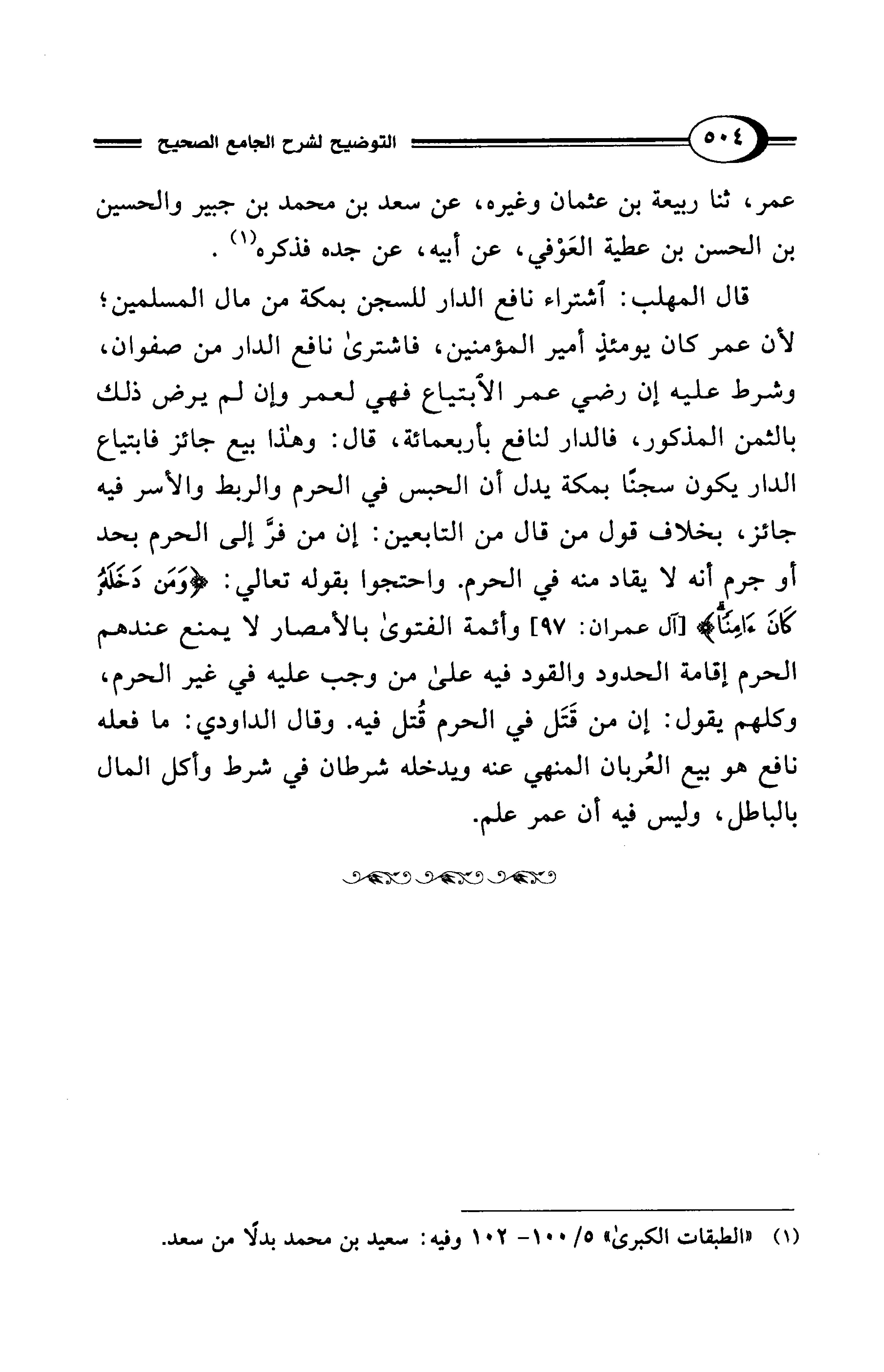 قال المهلب: اشتراء نافع الدار للسجن بمكة من مال المسلمين؛ لأن عمر كان يومئذٍ أمير المؤمنين، فاشترى نافع الدار من صفوان، وشرط عليه إن رضي عمر الابتياع فهي لعمر وإن لم يرض ذلك بالثمن المذكور، فالدار لنافع بأربعمائة، قال: وهذا بيع جائز فابتياع الدار يكون سجنًا بمكة يدل أن الحبس في الحرم والربط والأسر فيه جائز، بخلاف قول من قال من التابعين: إن من فرَّ إلى الحرم بحد أو جرم أنه لا يقاد منه في الحرم. واحتجوا بقوله تعالى {وَمَنْ دَخَلَهُ كَانَ آمِنًا} [آل عمران: 97] وأئمة الفتوى بالأمصار لا يمنع عندهم الحرم إقامة الحدود والقود فيه على من وجب عليه في غير الحرم، وكلهم يقول: إن من قَتَل في الحرم قُتل فيه. وقال الداودي: ما فعله نافع هو بيع العُربان المنهي عنه ويدخله شرطان في شرط وأكل المال بالباطل، وليس فيه أن عمر علم.