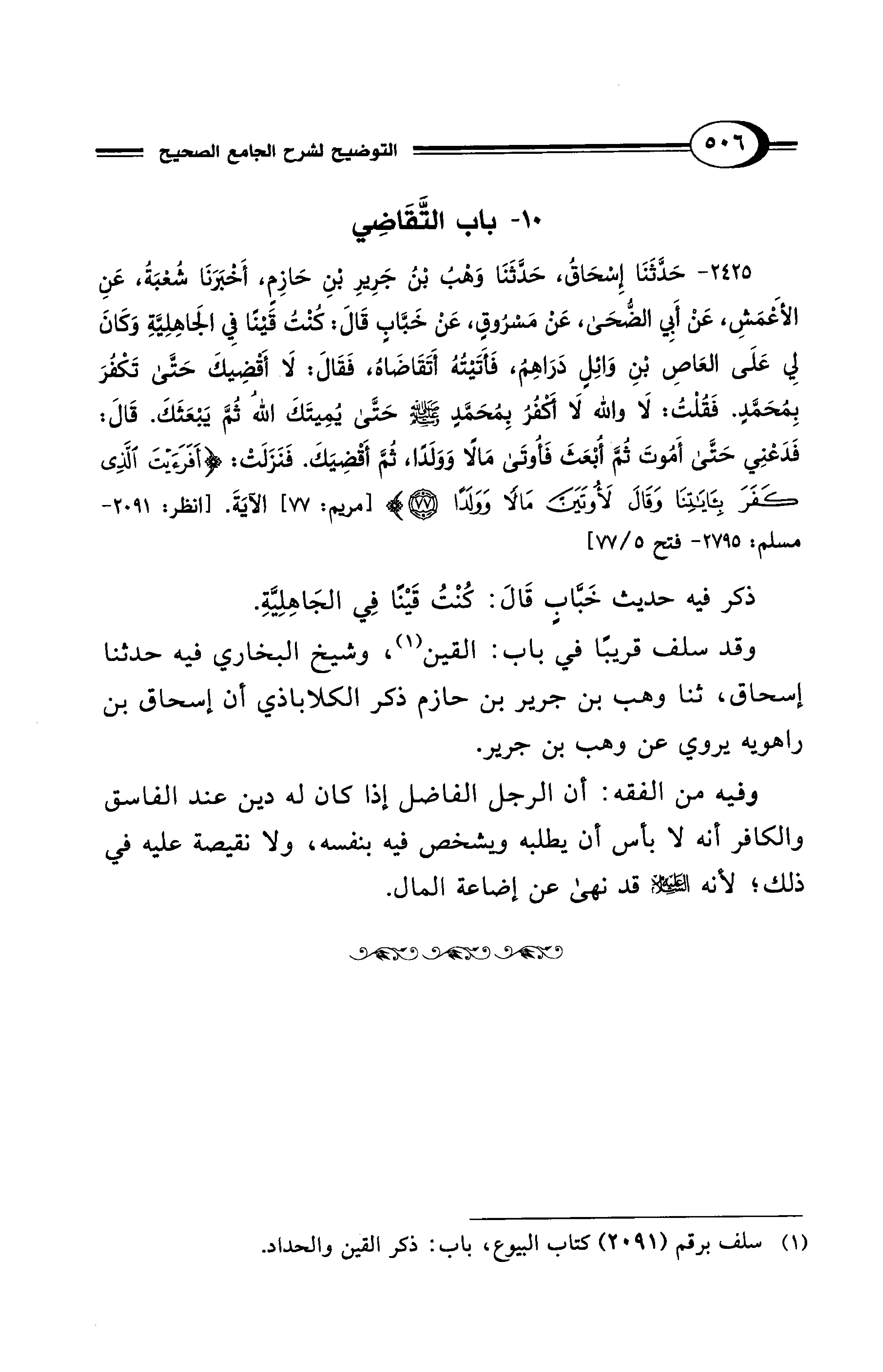 2425 - حَدَّثَنَا إِسْحَاقُ، حَدَّثَنَا وَهْبُ بْنُ جَرِيرِ بْنِ حَازِمٍ، أَخْبَرَنَا شُعْبَةُ، عَنِ الأَعْمَشِ، عَنْ أَبِي الضُّحَى، عَنْ مَسْرُوقٍ، عَنْ خَبَّابٍ قَالَ: كُنْتُ قَيْنًا فِي الجَاهِلِيَّةِ وَكَانَ لِي عَلَى العَاصِ بْنِ وَائِلٍ دَرَاهِمُ، فَأَتَيْتُهُ أَتَقَاضَاهُ، فَقَالَ: لَا أَقْضِيكَ حَتَّى تَكْفُرَ بِمُحَمَّدٍ. فَقُلْتُ: لَا وَاللهِ لَا أَكْفُرُ بِمُحَمَّدٍ - صلى الله عليه وسلم - حَتَّى يُمِيتَكَ اللهُ ثُمَّ يَبْعَثَكَ. قَالَ: فَدَعْنِي حَتَّى أَمُوتَ ثُمَّ أُبْعَثَ فَأُوتَى مَالًا وَوَلَدًا، ثُمَّ أَقْضِيَكَ. فَنَزَلَتْ: {أَفَرَأَيْتَ الَّذِي كَفَرَ بِآيَاتِنَا وَقَالَ لَأُوتَيَنَّ مَالًا وَوَلَدًا (77)} [مريم: 77] الآيَةَ. [انظر: 2091 مسلم: 2795 - فتح 5/ 77]