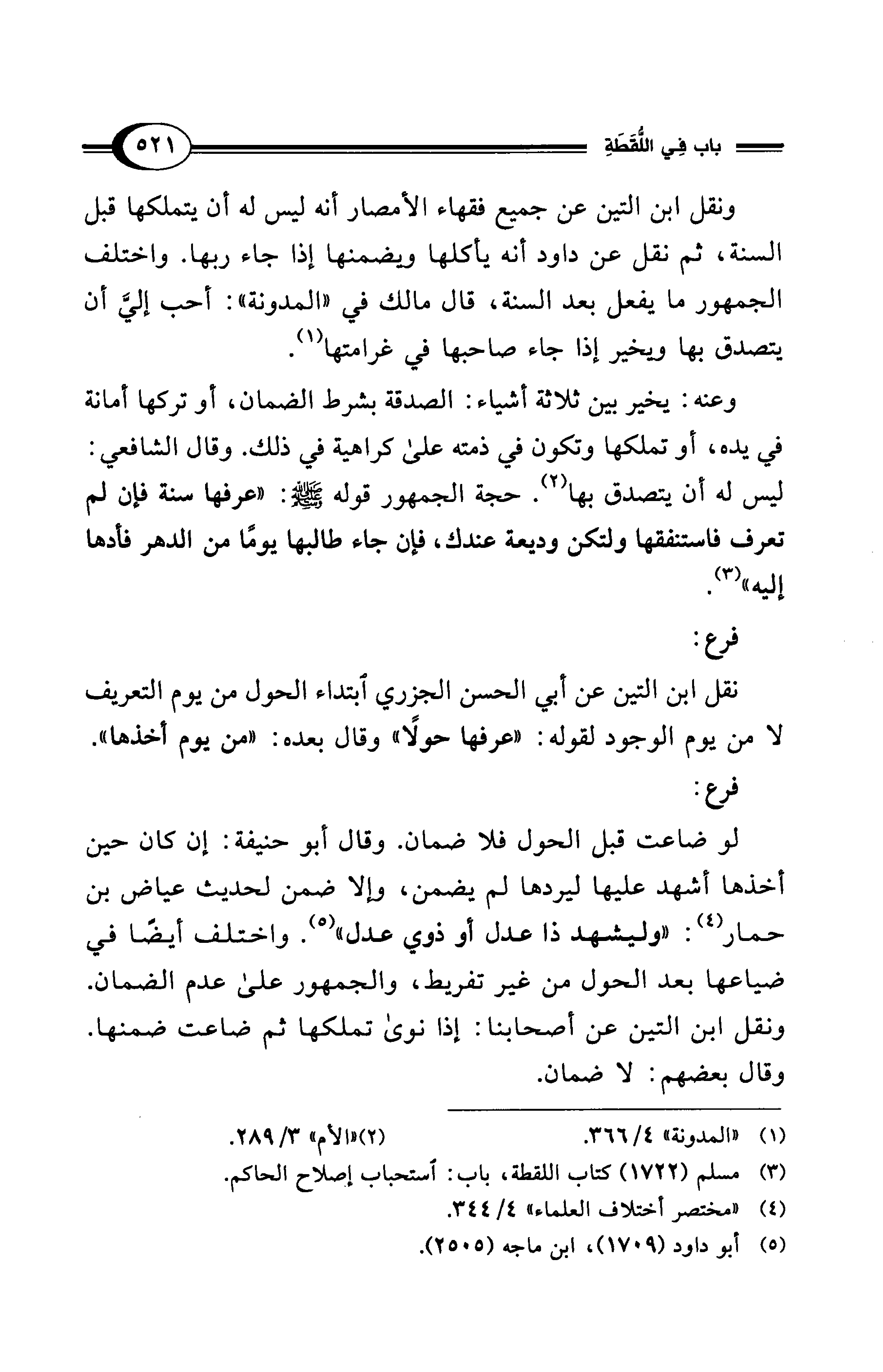 وعنه: يخير بين ثلاثة أشياء: الصدقة بشرط الضمان، أو تركها أمانة في يده، أو تملكها وتكون في ذمته على كراهية في ذلك. وقال الشافعي: ليس له أن يتصدق بها (¬2). حجة الجمهور قوله - صلى الله عليه وسلم -: "عرفها سنة فإن لم تعرف فاستنفقها ولتكن وديعة عندك، فإن جاء طالبها يومًا من الدهر فأدها إليه" (¬3).