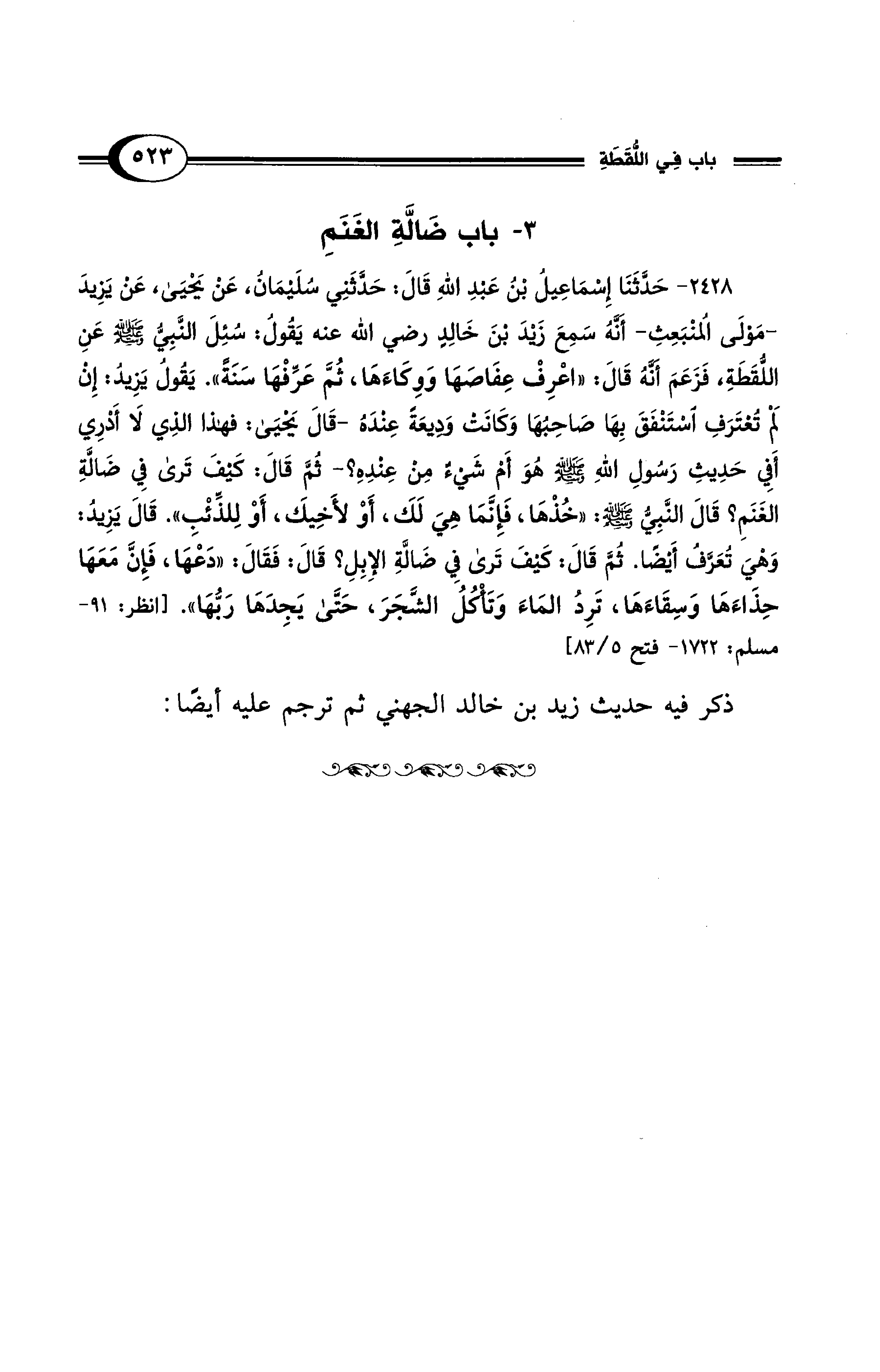 2428 - حَدَّثَنَا إِسْمَاعِيلُ بْنُ عَبْدِ اللهِ قَالَ: حَدَّثَنِي سُلَيْمَانُ، عَنْ يَحْيَى، عَنْ يَزِيدَ -مَوْلَى المُنْبَعِثِ- أَنَّهُ سَمِعَ زَيْدَ بْنَ خَالِدٍ رضي الله عنه يَقُولُ: سُئِلَ النَّبِيُّ - صلى الله عليه وسلم - عَنِ اللُّقَطَةِ، فَزَعَمَ أَنَّهُ قَالَ: "اعْرِفْ عِفَاصَهَا وَوِكَاءَهَا، ثُمَّ عَرِّفْهَا سَنَةً". يَقُولُ يَزِيدُ: إِنْ لَمْ تُعْتَرَفِ اسْتَنْفَقَ بِهَا صَاحِبُهَا وَكَانَتْ وَدِيعَةً عِنْدَهُ -قَالَ يَحْيَى: فَهَذَا الَّذِي لَا أَدْرِي أَفِي حَدِيثِ رَسُولِ اللهِ - صلى الله عليه وسلم - هُوَ أَمْ شَيْءٌ مِنْ عِنْدِهِ؟ - ثُمَّ قَالَ: كَيْفَ تَرَى فِي ضَالَّةِ الغَنَمِ؟ قَالَ النَّبِيُّ - صلى الله عليه وسلم -: "خُذْهَا، فَإِنَّمَا هِىَ لَكَ، أَوْ لأَخِيكَ، أَوْ لِلذِّئْبِ". قَالَ يَزِيدُ: وَهْيَ تُعَرَّفُ أَيْضًا. ثُمَّ قَالَ: كَيْفَ تَرَى فِي ضَالَّةِ الإِبِلِ؟ قَالَ: فَقَالَ: "دَعْهَا، فَإِنَّ مَعَهَا حِذَاءَهَا وَسِقَاءَهَا، تَرِدُ المَاءَ وَتَأْكُلُ الشَّجَرَ، حَتَّى يَجِدَهَا رَبُّهَا". [انظر: 91 - مسلم: 1722 - فتح 5/ 83]
