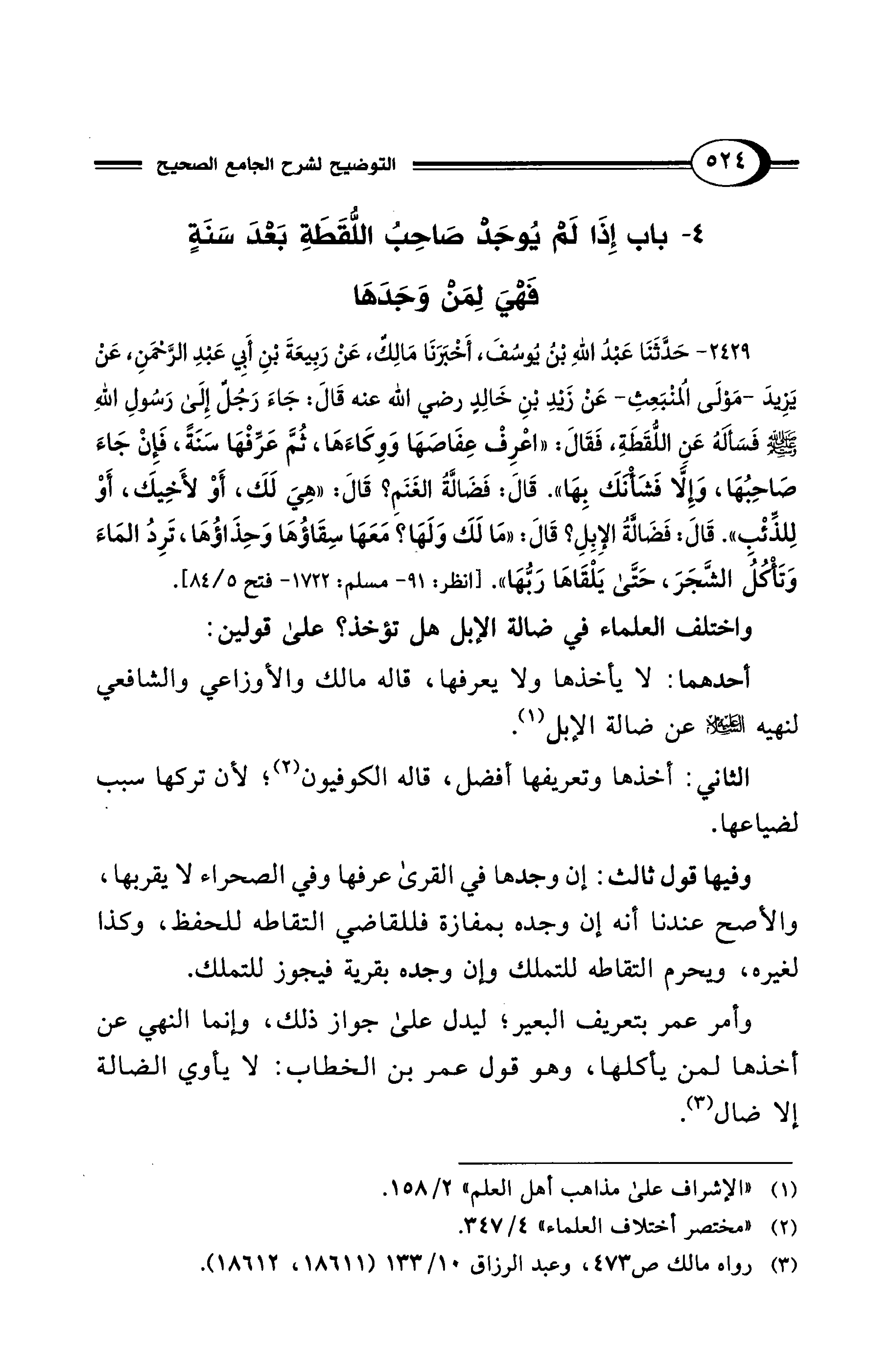 2429 - حَدَّثَنَا عَبْدُ اللهِ بْنُ يُوسُفَ، أَخْبَرَنَا مَالِكٌ، عَنْ رَبِيعَةَ بْنِ أَبِي عَبْدِ الرَّحْمَنِ، عَنْ يَزِيدَ -مَوْلَى المُنْبَعِثِ- عَنْ زَيْدِ بْنِ خَالِدٍ رضي الله عنه قَالَ: جَاءَ رَجُلٌ إِلَى رَسُولِ اللهِ - صلى الله عليه وسلم - فَسَأَلَهُ عَنِ اللُّقَطَةِ، فَقَالَ: "اعْرِفْ عِفَاصَهَا وَوِكَاءَهَا، ثُمَّ عَرِّفْهَا سَنَةً، فَإِنْ جَاءَ صَاحِبُهَا، وَإِلاَّ فَشَأْنَكَ بِهَا". قَالَ: فَضَالَّةُ الغَنَمِ؟ قَالَ: "هِيَ لَكَ، أَوْ لأَخِيكَ أَوْ لِلذِّئْبِ". قَالَ: فَضَالَّةُ الإِبِلِ؟ قَالَ: "مَا لَكَ وَلَهَا؟ مَعَهَا سِقَاؤُهَا وَحِذَاؤُهَا، تَرِدُ المَاءَ وَتَأْكُلُ الشَّجَرَ، حَتَّى يَلْقَاهَا رَبُّهَا". [انظر: 91 - مسلم: 1722 - فتح 5/ 84].