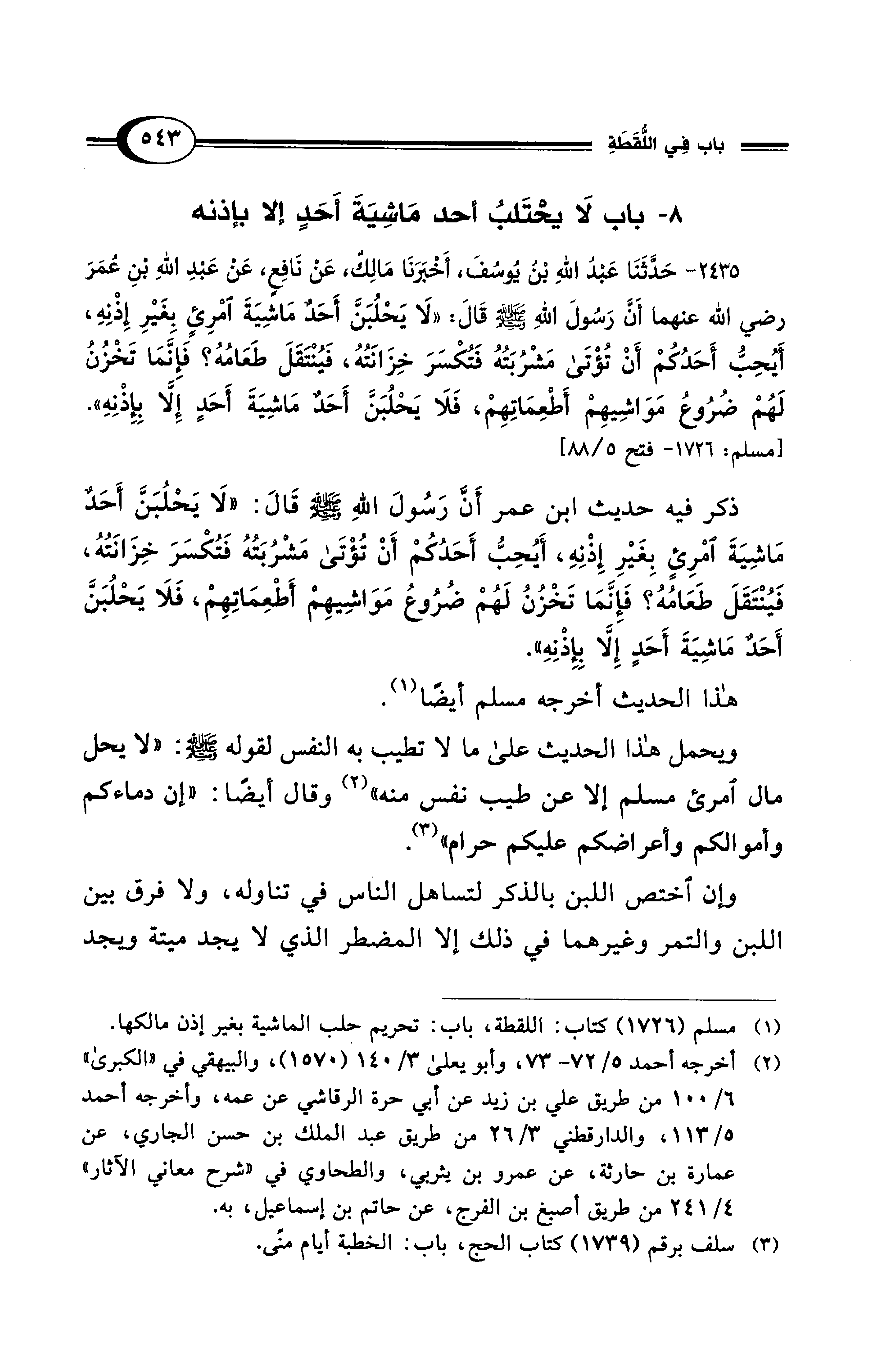 ذكر فيه حديث ابن عمر أَنَّ رَسُولَ اللهِ - صلى الله عليه وسلم - قَالَ: "لَا يَحْلُبَنَّ أَحَدٌ مَاشِيَةَ امْرِئٍ بِغَيْرِ إِذْنِهِ، أَيُحِبُّ أَحَدُكُمْ أَنْ تُؤْتَى مَشْرُبَتُهُ فَتُكْسَرَ خِزَانَتُهُ، فَيُنْتَقَلَ طَعَامُهُ؟ فَإِنَّمَا تَخْزُنُ لَهُمْ ضُرُوعُ مَوَاشِيهِمْ أَطْعِمَاتِهِمْ، فَلاَ يَحْلُبَنَّ أَحَدٌ مَاشِيَةَ أَحَدٍ إِلَّا بِإِذْنِهِ".