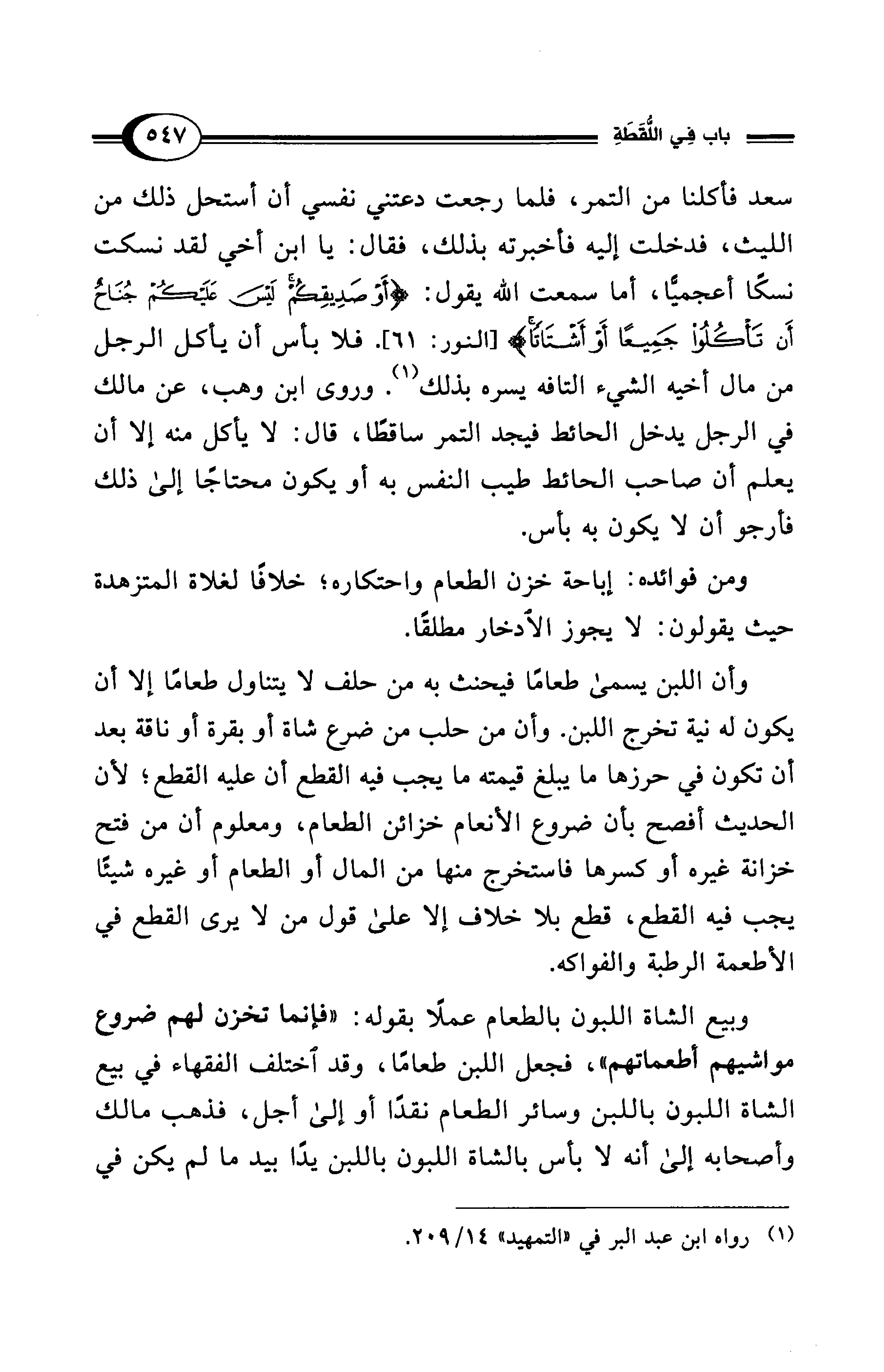 سعد فأكلنا من التمر، فلما رجعت دعتني نفسي أن أستحل ذلك من الليث، فدخلت إليه فأخبرته بذلك، فقال: يا ابن أخي لقد نسكت نسكًا أعجميًّا، أما سمعت الله يقول: {أَوْ صَدِيقِكُمْ لَيْسَ عَلَيْكُمْ جُنَاحٌ أَنْ تَأْكُلُوا جَمِيعًا أَوْ أَشْتَاتًا} [النور: 61]. فلا بأس أن يأكل الرجل من مال أخيه الشيء التافه يسره بذلك (¬1). وروى ابن وهب، عن مالك في الرجل يدخل الحائط فيجد التمر ساقطًا، قال: لا يأكل منه إلا أن يعلم أن صاحب الحائط طيب النفس به أو يكون محتاجًا إلى ذلك فأرجو أن لا يكون به بأس.