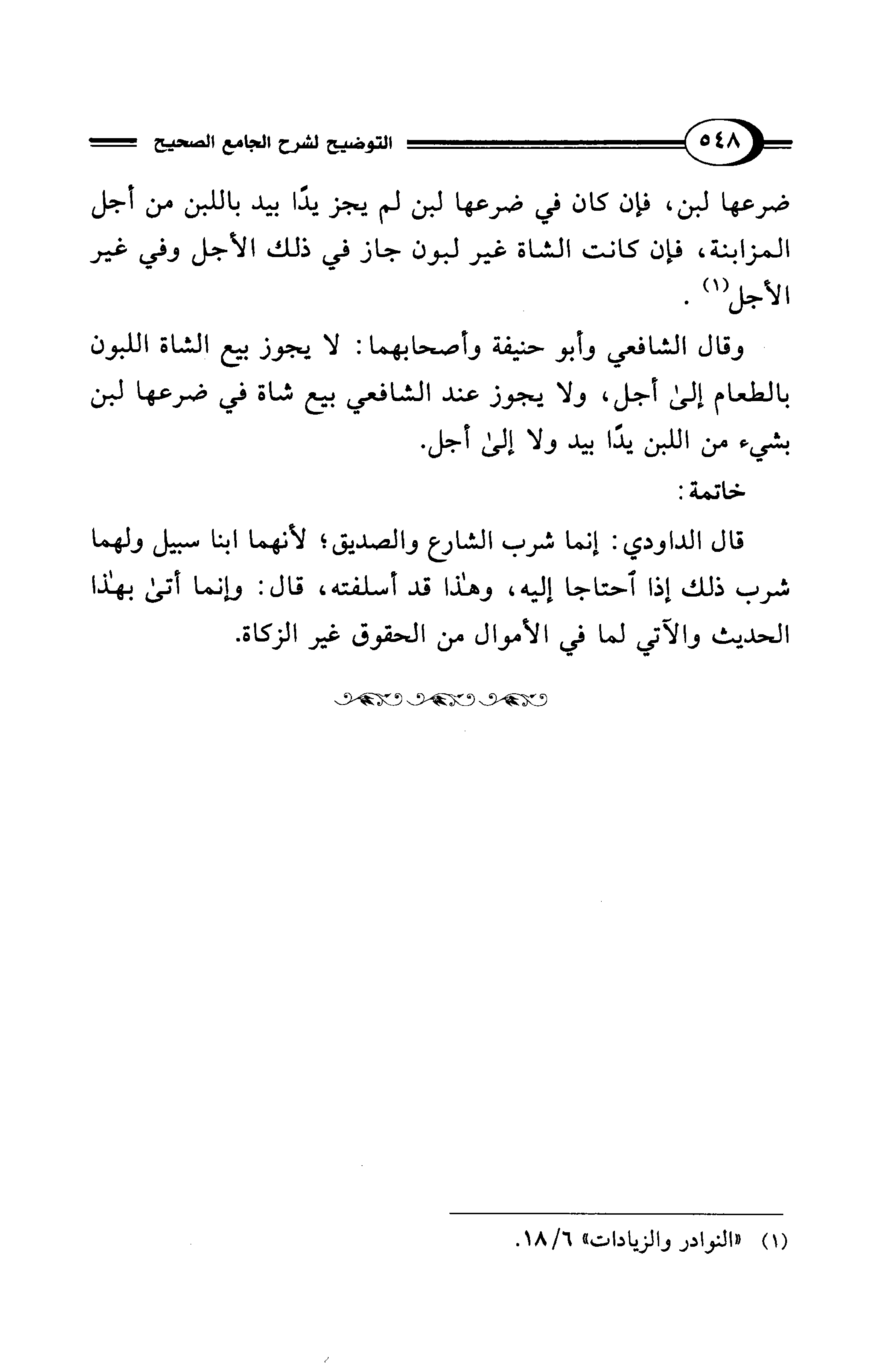 ضرعها لبن، فإن كان في ضرعها لبن لم يجز يدًا بيد باللبن من أجل المزابنة، فإن كانت الشاة غير لبون جاز في ذلك الأجل وفي غير الأجل (¬1).