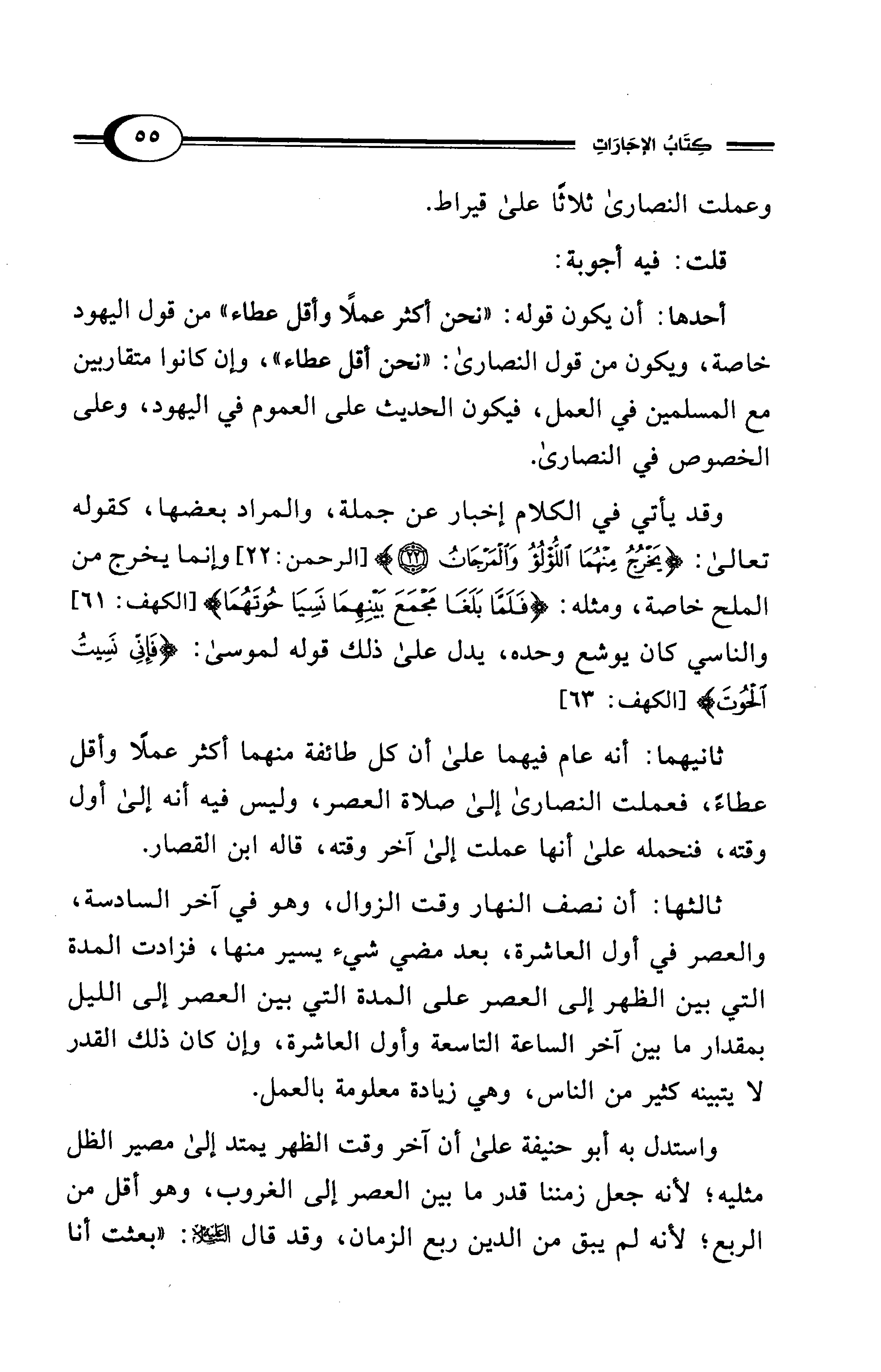 ثانيهما: أنه عام فيهما على أن كل طائفة منهما أكثر عملًا وأقل عطاءً، فعملت النصارى إلى صلاة العصر، وليس فيه أنه إلى أول وقته، فنحمله على أنها عملت إلى آخر وقته، قاله ابن القصار.