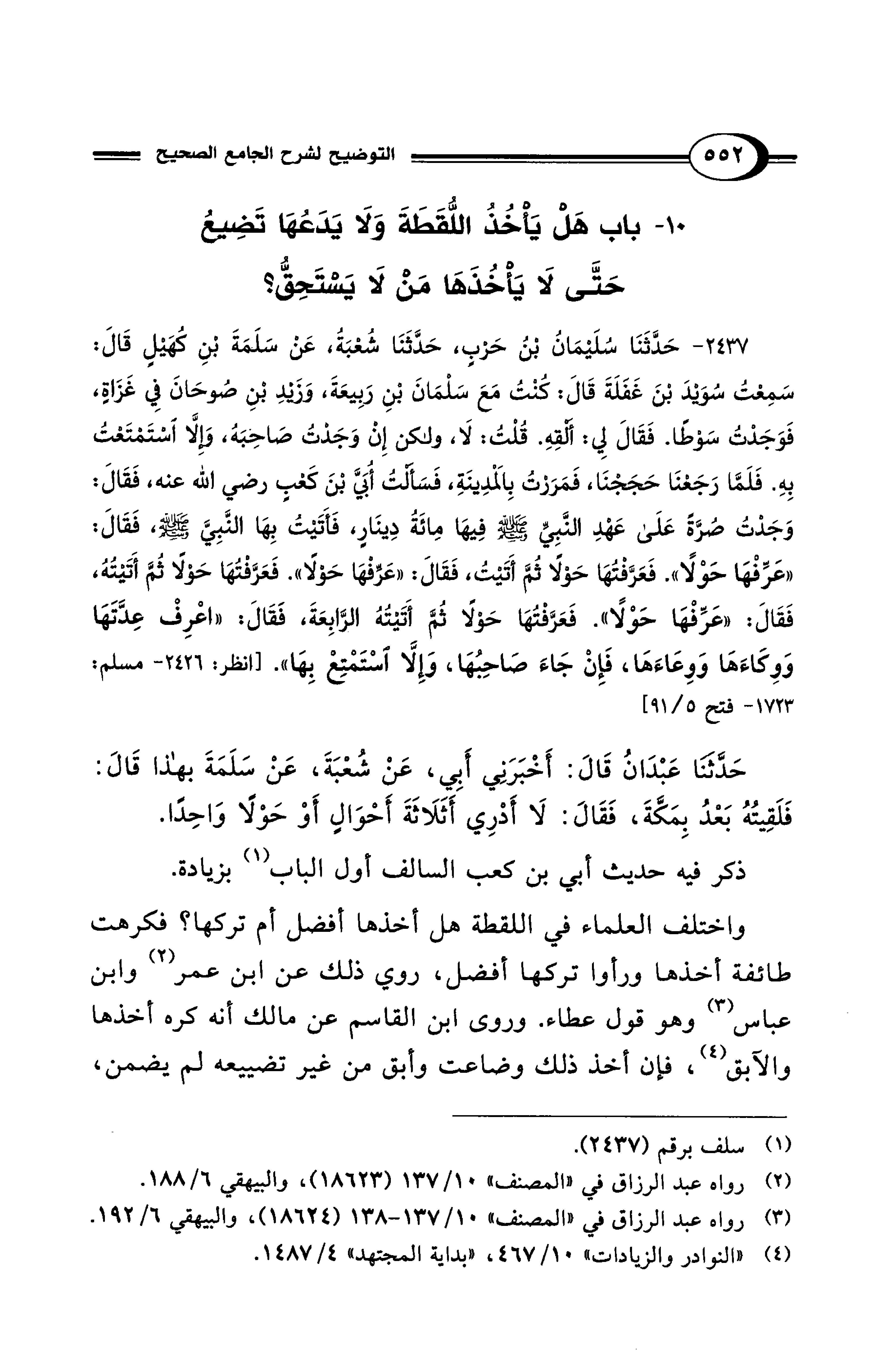 2437 - حَدَّثَنَا سُلَيْمَانُ بْنُ حَرْبٍ، حَدَّثَنَا شُعْبَةُ، عَنْ سَلَمَةَ بْنِ كُهَيْلٍ قَالَ: سَمِعْتُ سُوَيْدَ بْنَ غَفَلَةَ قَالَ: كُنْتُ مَعَ سَلْمَانَ بْنِ رَبِيعَةَ، وَزَيْدِ بْنِ صُوحَانَ فِي غَزَاةٍ، فَوَجَدْتُ سَوْطًا. فَقَالَ لِي: أَلْقِهِ. قُلْتُ: لَا، وَلَكِنْ إِنْ وَجَدْتُ صَاحِبَهُ، وَإِلَّا اسْتَمْتَعْتُ بِهِ. فَلَمَّا رَجَعْنَا حَجَجْنَا، فَمَرَرْتُ بِالمَدِينَةِ، فَسَأَلْتُ أُبَيَّ بْنَ كَعْبٍ رضى الله عنه، فَقَالَ: وَجَدْتُ صُرَّةً عَلَى عَهْدِ النَّبِيِّ - صلى الله عليه وسلم - فِيهَا مِائَةُ دِينَارٍ، فَأَتَيْتُ بِهَا النَّبِيَّ - صلى الله عليه وسلم -، فَقَالَ: "عَرِّفْهَا حَوْلًا". فَعَرَّفْتُهَا حَوْلًا ثُمَّ أَتَيْتُ، فَقَالَ: "عَرِّفْهَا حَوْلًا". فَعَرَّفْتُهَا حَوْلًا ثُمَّ أَتَيْتُهُ، فَقَالَ: "عَرِّفْهَا حَوْلًا". فَعَرَّفْتُهَا حَوْلًا ثُمَّ أَتَيْتُهُ الرَّابِعَةَ، فَقَالَ: "اعْرِفْ عِدَّتَهَا وَوِكَاءَهَا وَوِعَاءَهَا، فَإِنْ جَاءَ صَاحِبُهَا، وَإِلَّا اسْتَمْتِعْ بِهَا". [انظر: 2426 - مسلم: 1723 - فتح 5/ 91]