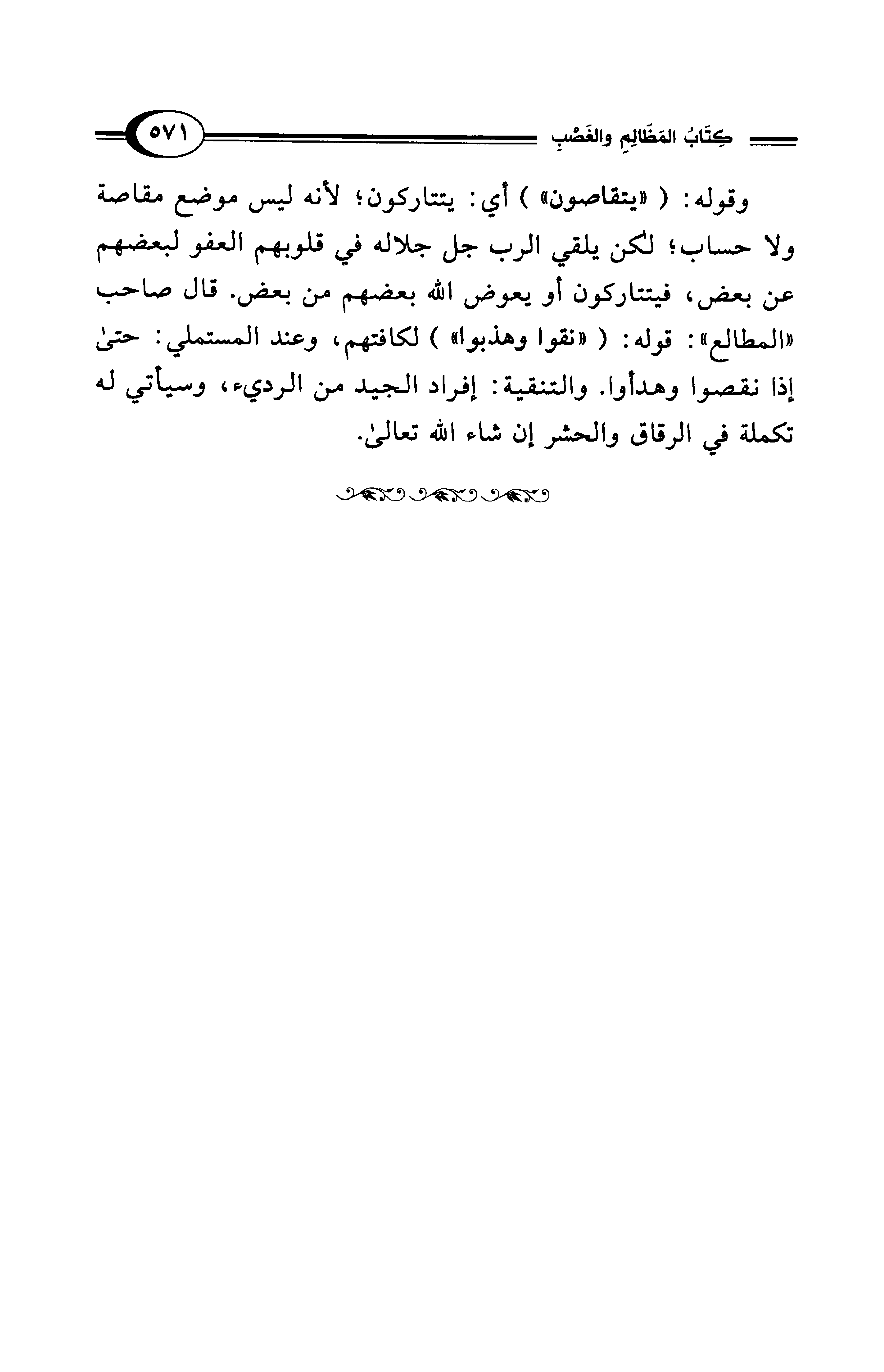 وقوله: ("يتقاصون") أي: يتتاركون؛ لأنه ليس موضع مقاصة ولا حساب؛ لكن يلقي الرب جل جلاله في قلوبهم العفو لبعضهم عن بعض، فيتتاركون أو يعوض الله بعضهم من بعض. قال صاحب "المطالع": قوله: ("نقوا وهذبوا") لكافتهم، وعند المستملي: حتى إذا نقصوا وهدأوا. والتنقية: إفراد الجيد من الرديء، وسيأتي له تكملة في الرقاق والحشر إن شاء الله تعالى.