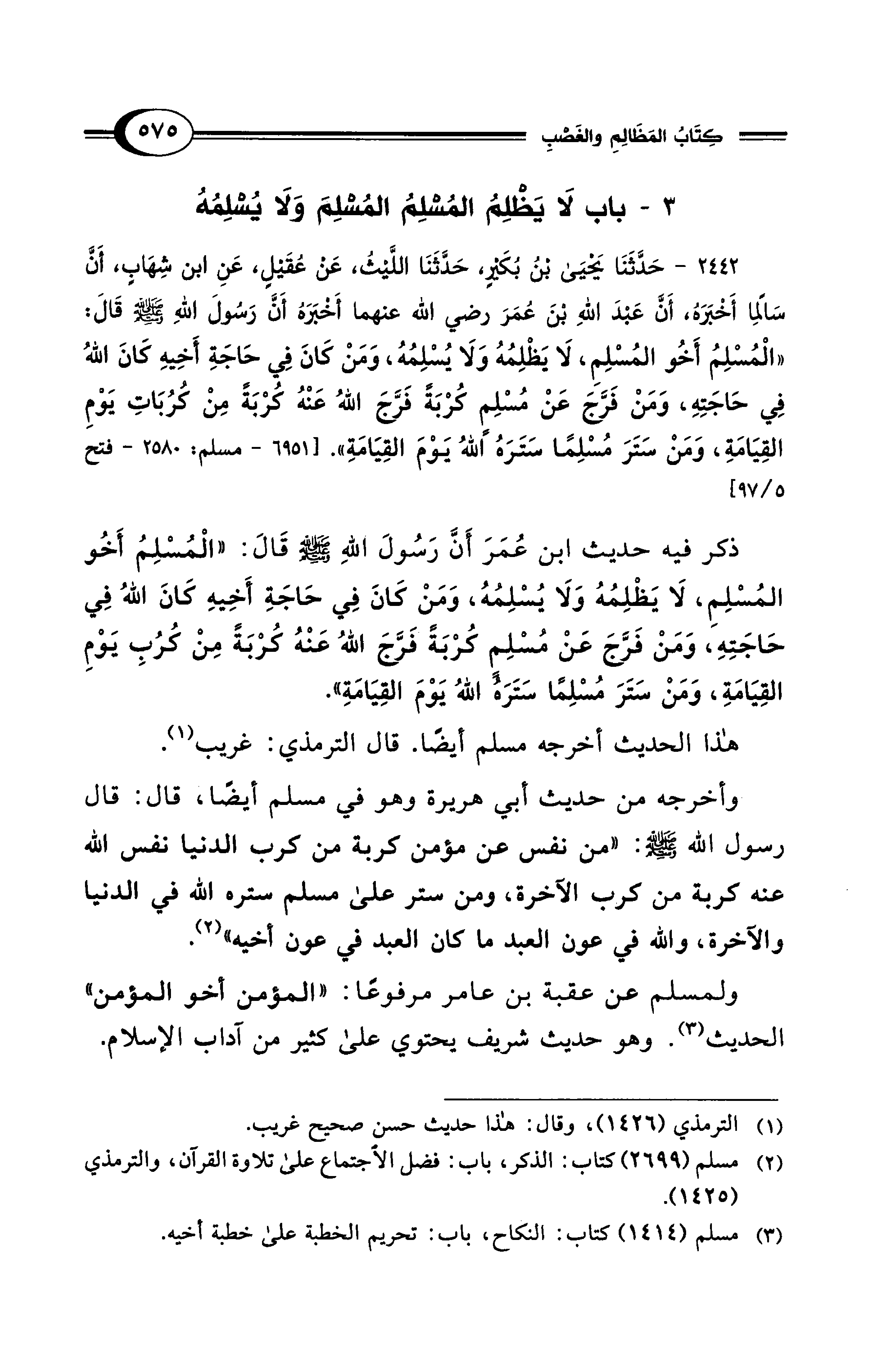 2442 - حَدَّثَنَا يَحْيَى بْنُ بُكَيْرٍ، حَدَّثَنَا اللَّيْثُ، عَنْ عُقَيْلٍ، عَنِ ابْنِ شِهَابٍ، أَنَّ سَالِمًا أَخْبَرَهُ، أَنَّ عَبْدَ اللهِ بْنَ عُمَرَ رضي الله عنهما أَخْبَرَهُ أَنَّ رَسُولَ اللهِ - صلى الله عليه وسلم - قَالَ: "المُسْلِمُ أَخُو المُسْلِمِ، لَا يَظْلِمُهُ وَلَا يُسْلِمُهُ، وَمَنْ كَانَ فِي حَاجَةِ أَخِيهِ كَانَ اللهُ فِي حَاجَتِهِ، وَمَنْ فَرَّجَ عَنْ مُسْلِمٍ كُرْبَةً فَرَّجَ اللهُ عَنْهُ كُرْبَةً مِنْ كُرُبَاتِ يَوْمِ القِيَامَةِ، وَمَنْ سَتَرَ مُسْلِمًا سَتَرَهُ اللهُ يَوْمَ القِيَامَةِ". [6951 - مسلم: 2580 - فتح 5/ 97]