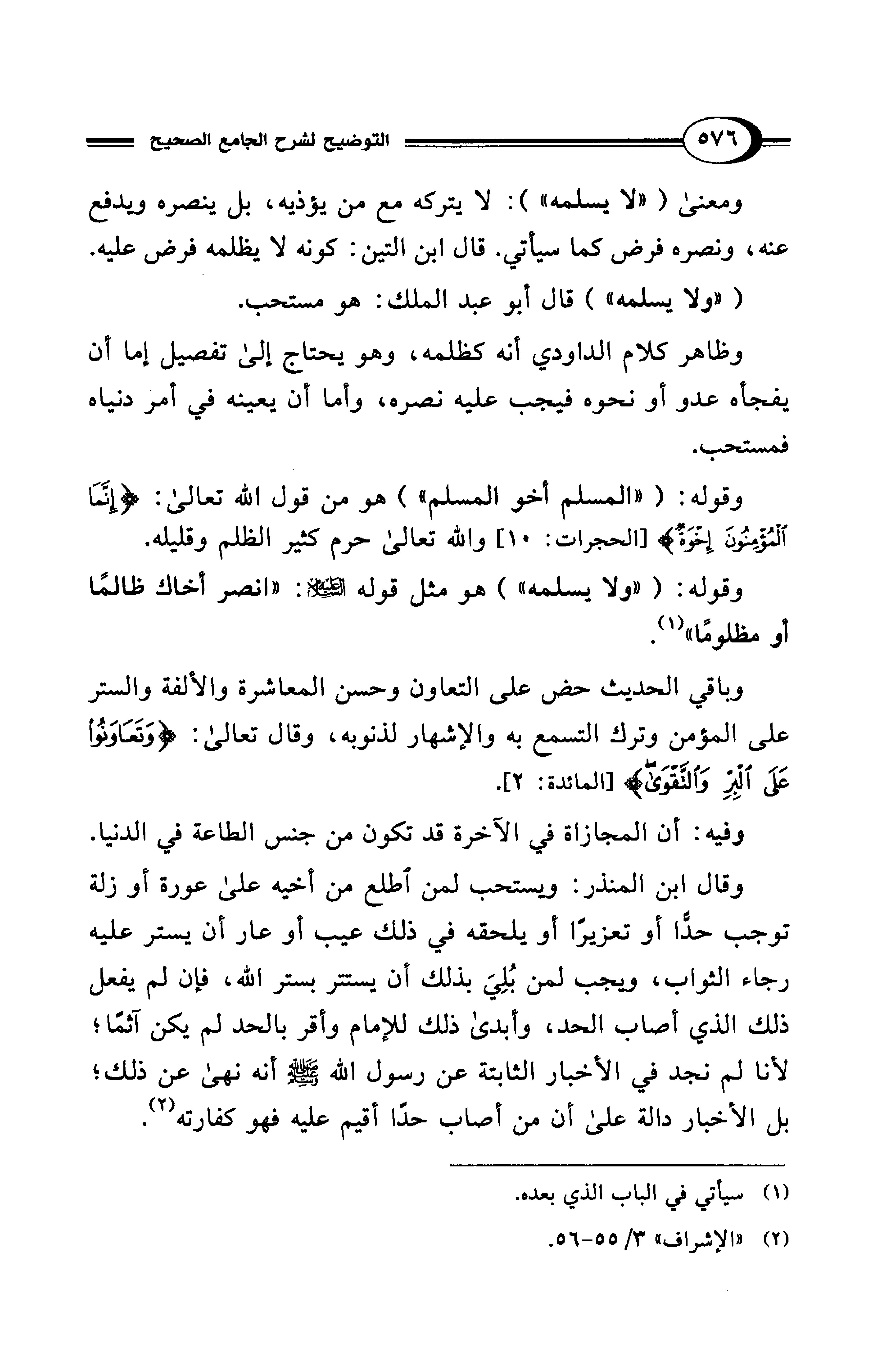 ومعنى ("لا يسلمه"): لا يتركه مع من يؤذيه، بل ينصره ويدفع عنه، ونصره فرض كما سيأتي. قال ابن التين: كونه لا يظلمه فرض عليه.