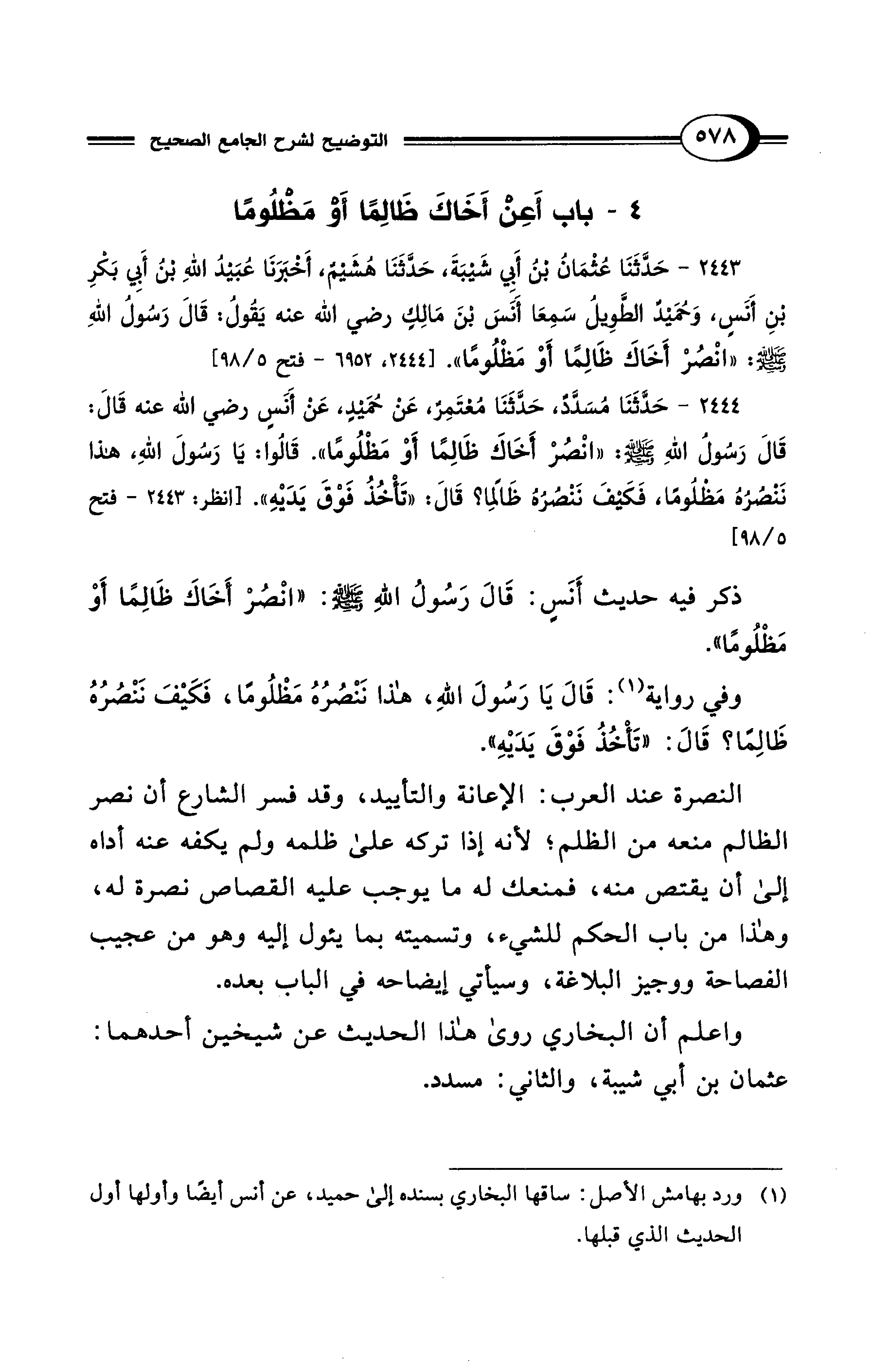2444 - حَدَّثَنَا مُسَدَّدٌ، حَدَّثَنَا مُعْتَمِرٌ، عَنْ حُمَيْدٍ، عَنْ أَنَسٍ رضي الله عنه قَالَ: قَالَ رَسُولُ اللهِ - صلى الله عليه وسلم -: "انْصُرْ أَخَاكَ ظَالِمًا أَوْ مَظْلُومًا". قَالُوا: يَا رَسُولَ اللهِ، هَذَا نَنْصُرُهُ مَظْلُومًا، فَكَيْفَ نَنْصُرُهُ ظَالِمًا؟ قَالَ: "تَأْخُذُ فَوْقَ يَدَيْهِ". [انظر: 2443 - فتح 5/ 98]