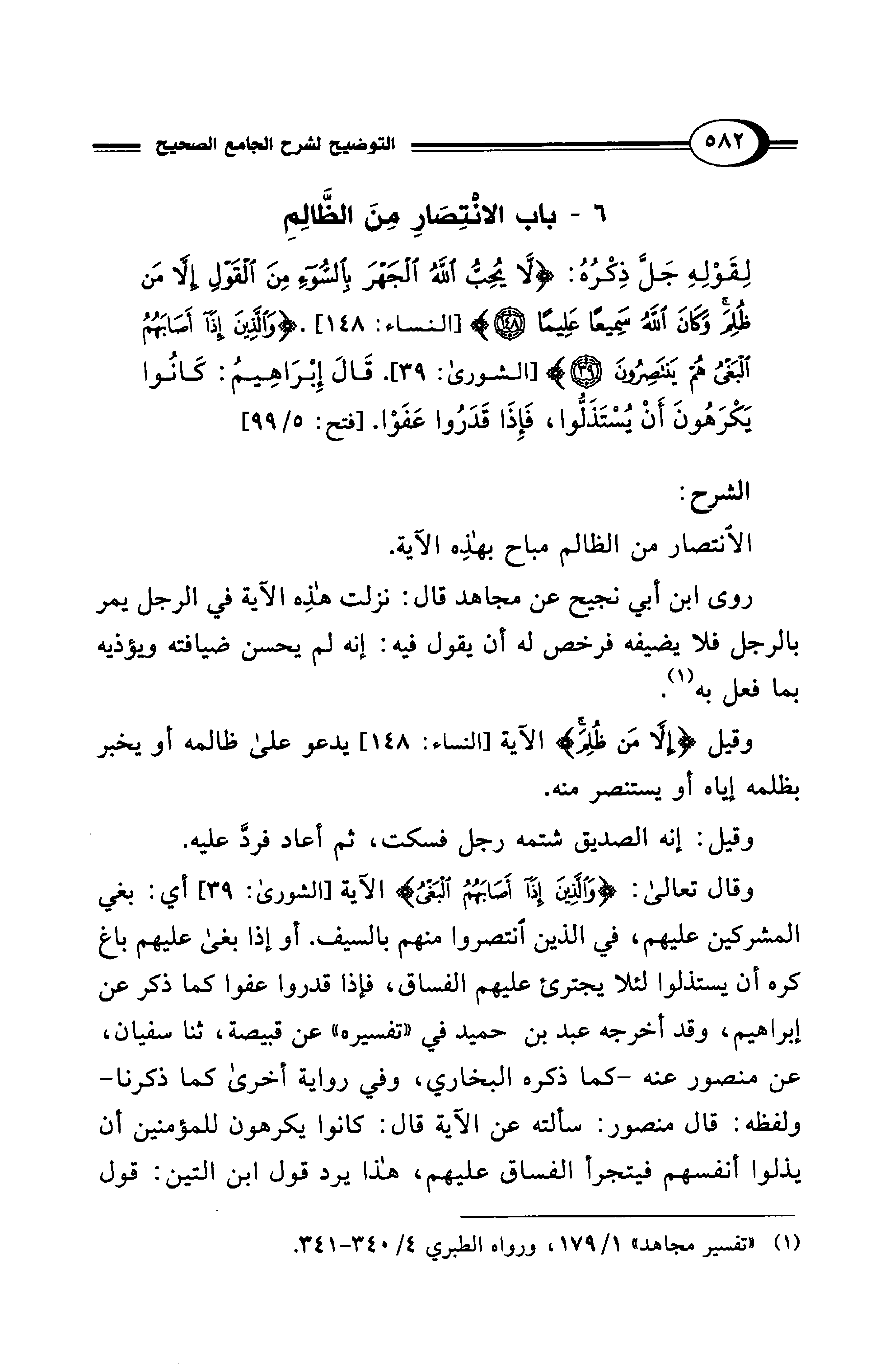لِقَوْلِهِ جَلَّ ذِكْرُهُ: {لَا يُحِبُّ اللهُ الجَهْرَ بِالسُّوءِ مِنَ القَوْلِ إِلَّا مَنْ ظُلِمَ وَكَانَ اللهُ سَمِيعًا عَلِيمًا} [النساء: 148]. {وَالَّذِينَ إِذَا أَصَابَهُمُ البَغْىُ هُمْ يَنْتَصِرُونَ} [الشورى: 39]. قَالَ إِبْرَاهِيمُ: كَانُوا يَكْرَهُونَ أَنْ يُسْتَذَلُّوا، فَإِذَا قَدَرُوا عَفَوْا. [فتح: 5/ 99]