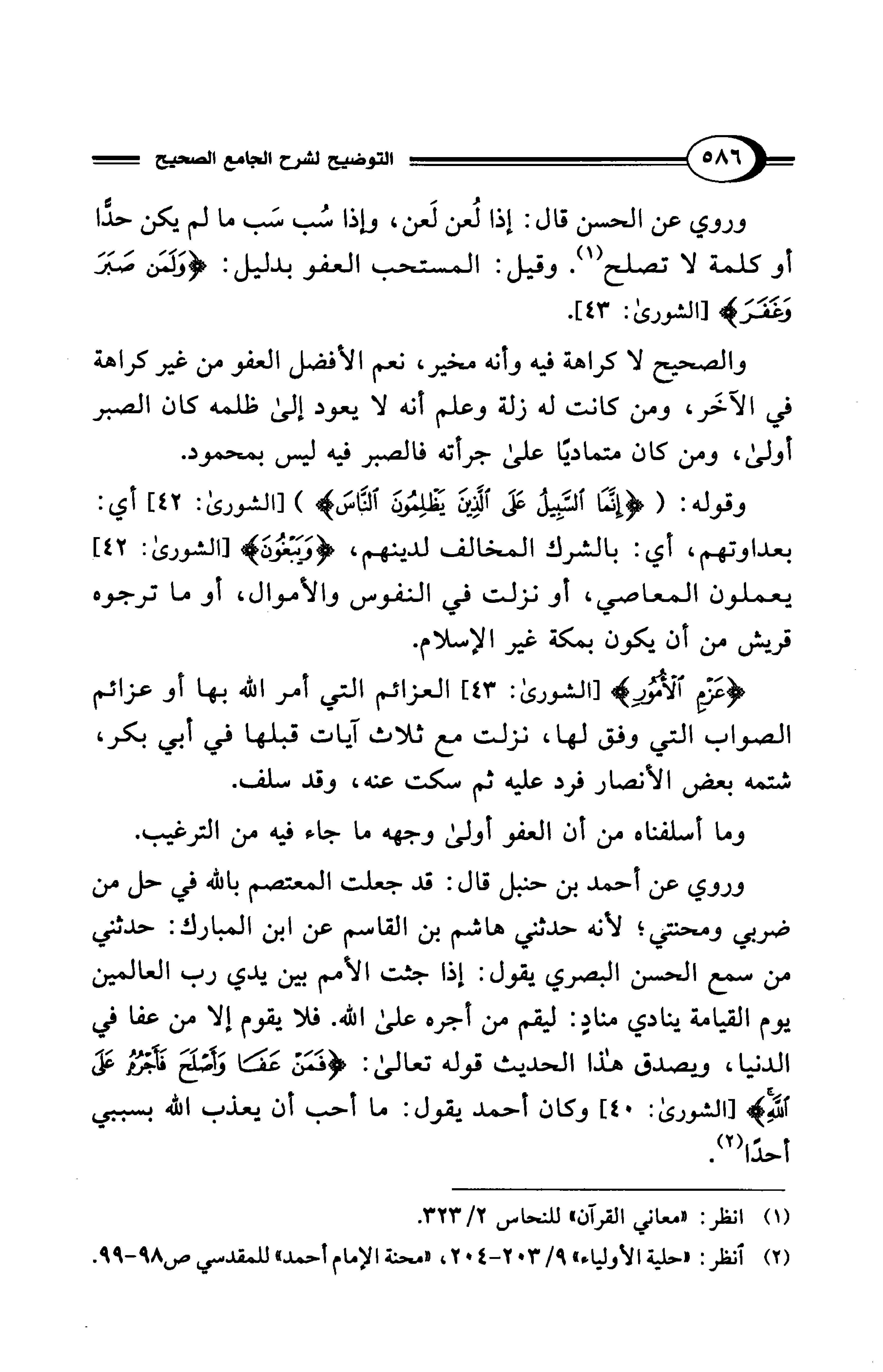 والصحيح لا كراهة فيه وأنه مخير، نعم الأفضل العفو من غير كراهة في الآخَر، ومن كانت له زلة وعلم أنه لا يعود إلى ظلمه كان الصبر أولى، ومن كان متماديًا على جرأته فالصبر فيه ليس بمحمود.