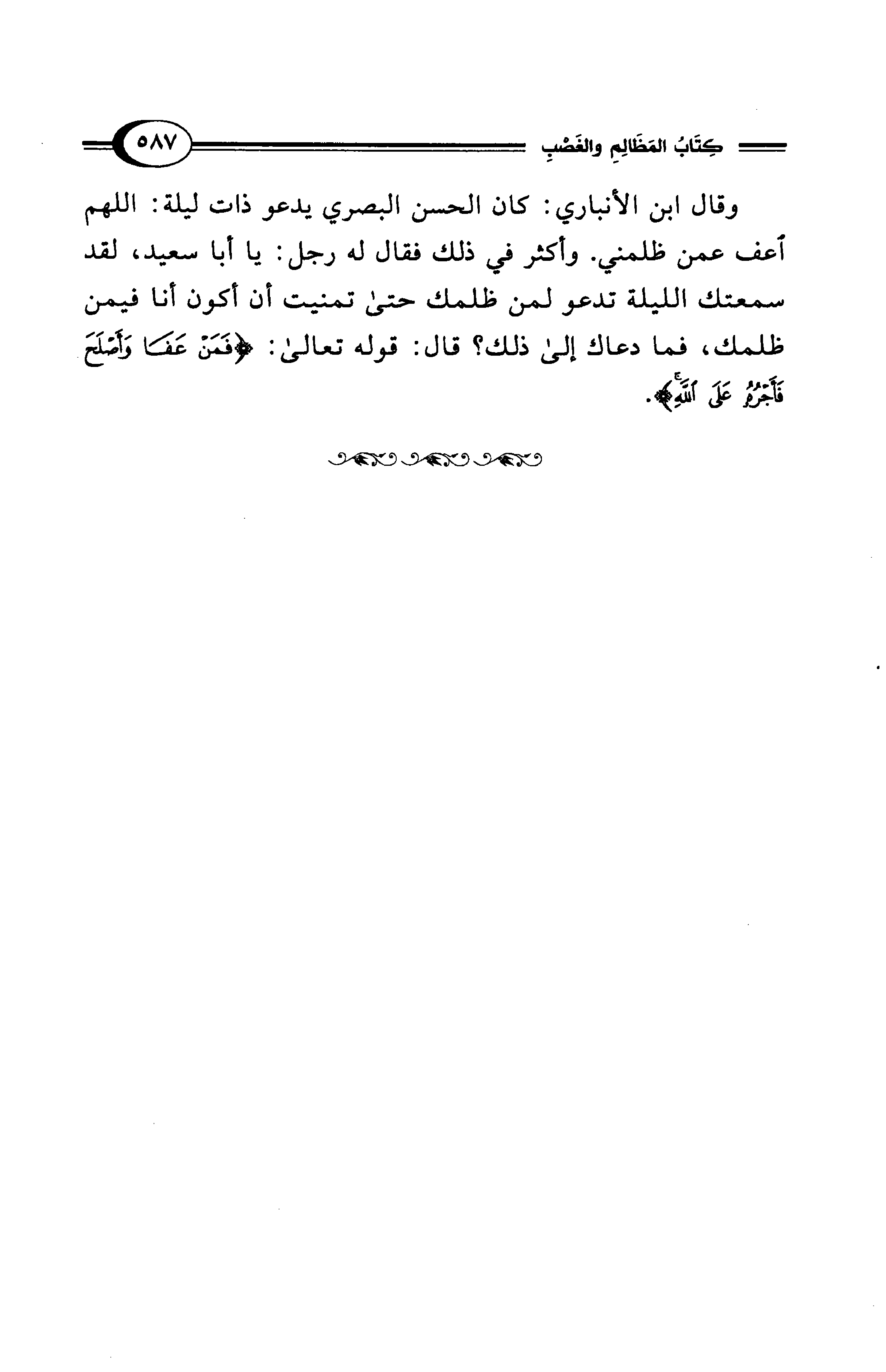 وقال ابن الأنباري: كان الحسن البصري يدعو ذات ليلة: اللهم اعف عمن ظلمني. وأكثر في ذلك فقال له رجل: يا أبا سعيد، لقد سمعتك الليلة تدعو لمن ظلمك حتى تمنيت أن أكون أنا فيمن ظلمك، فما دعاك إلى ذلك: قال: قوله تعالى: {فَمَنْ عَفَا وَأَصْلَحَ فَأَجْرُهُ عَلَى اللهِ}.
