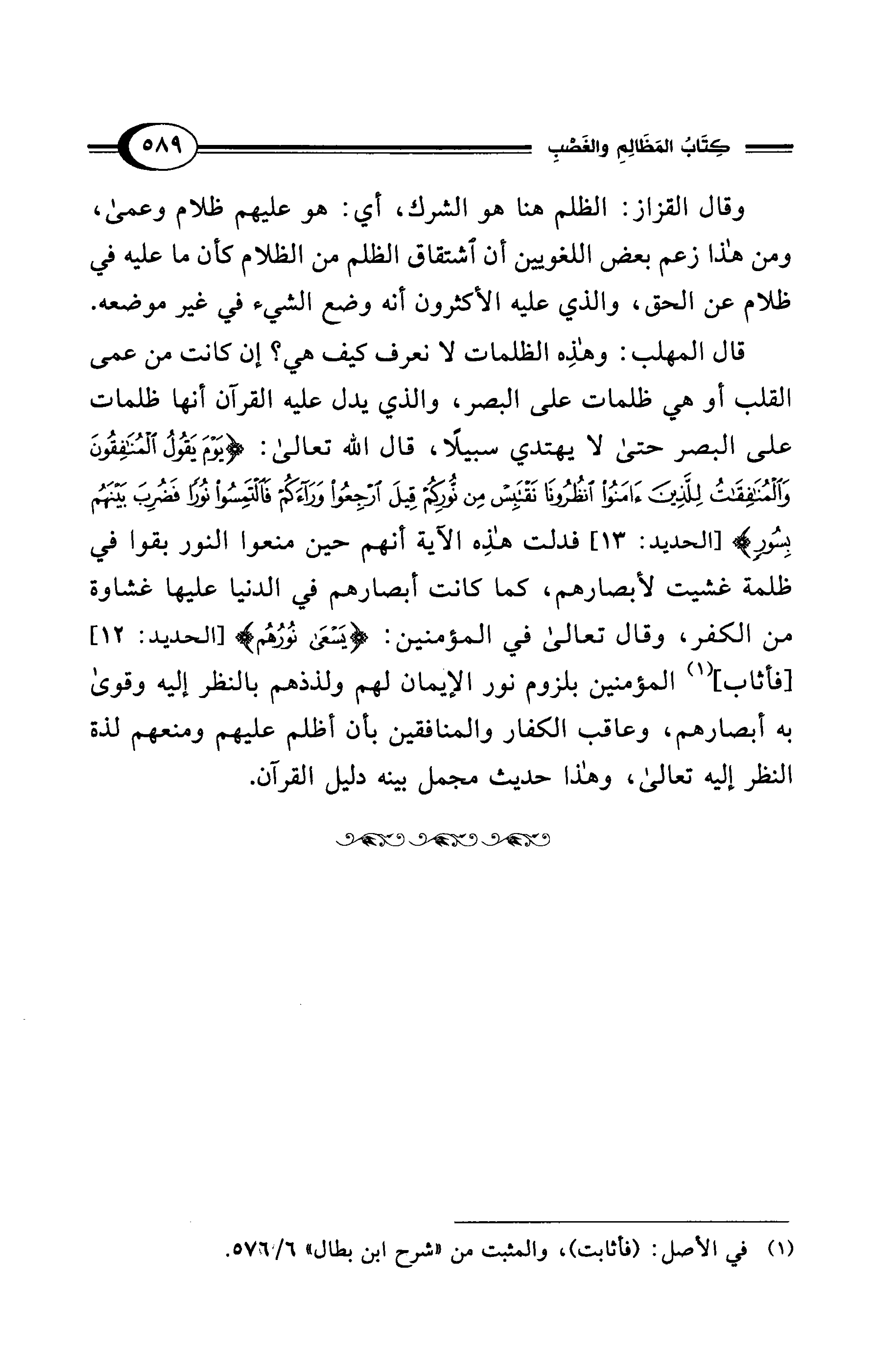 قال المهلب: وهذِه الظلمات لا نعرف كيف هي؟ إن كانت من عمى القلب أو هي ظلمات على البصر، والذي يدل عليه القرآن أنها ظلمات على البصر حتى لا يهتدي سبيلًا، قال الله تعالى: {يَوْمَ يَقُولُ المُنَافِقُونَ وَالمُنَافِقَاتُ لِلَّذِينَ آمَنُوا انْظُرُونَا نَقْتَبِسْ مِنْ نُورِكُمْ قِيلَ ارْجِعُوا وَرَاءَكُمْ فَالتَمِسُوا نُورًا فَضُرِبَ بَيْنَهُمْ بِسُورٍ} [الحديد: 13] فدلت هذِه الآية أنهم حين منعوا النور بقوا في ظلمة غشيت لأبصارهم، كما كانت أبصارهم في الدنيا عليها غشاوة من الكفر، وقال تعالى في المؤمنين: {يَسْعَى نُورُهُمْ} [الحديد: 12] [فأثاب] (¬1) المؤمنين بلزوم نور الإيمان لهم ولذذهم بالنظر إليه وقوى
