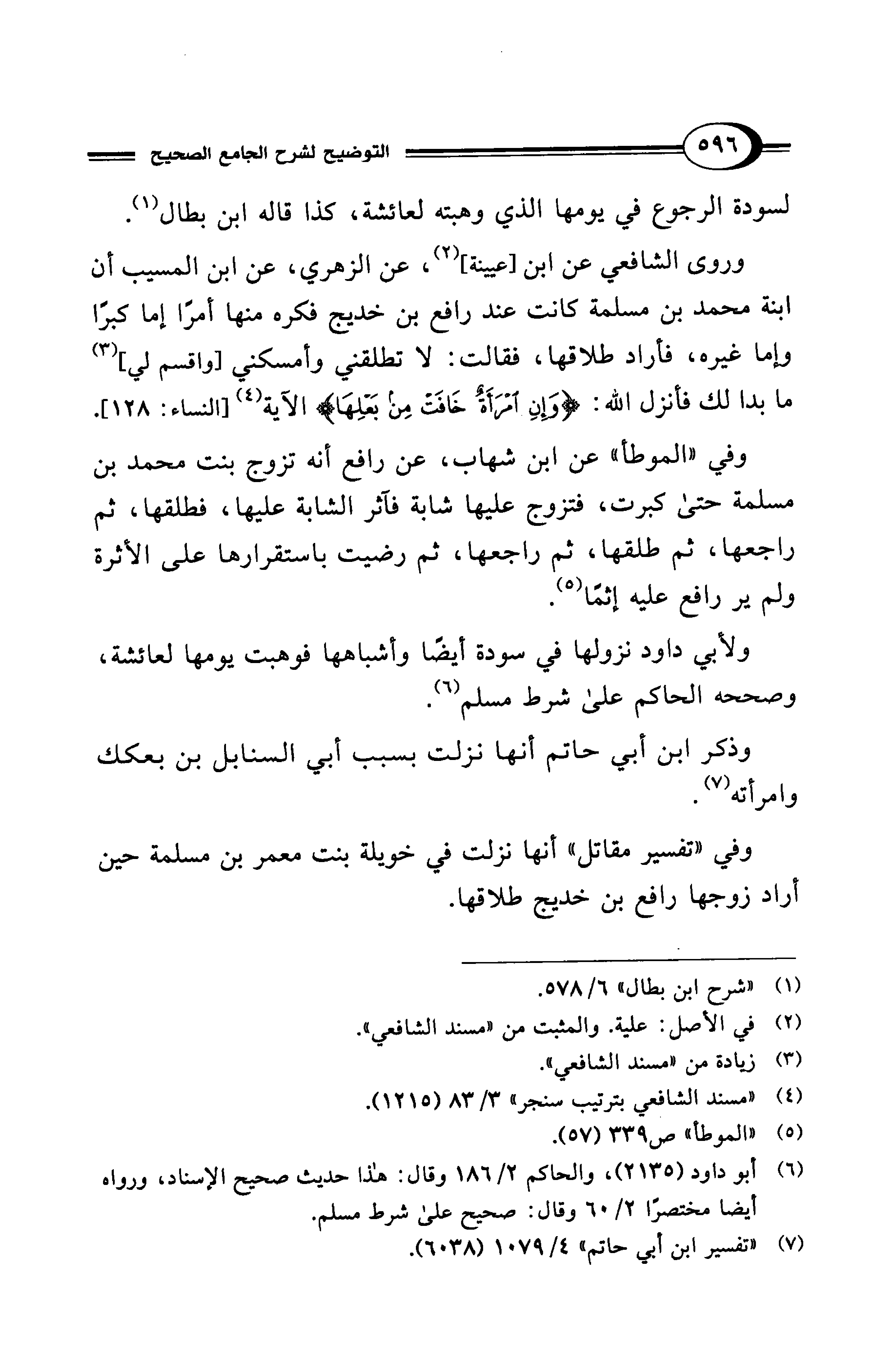 وروى الشافعي عن ابن [عيينة] (¬2)، عن الزهري، عن ابن المسيب أن ابنة محمد بن مسلمة كانت عند رافع بن خديج فكره منها أمرًا إما كبرًا وإما غيره، فأراد طلاقها، فقالت: لا تطلقني وأمسكني [واقسم لي] (¬3) ما بدا لك فأنزل الله: {وَإِنِ امْرَأَةٌ خَافَتْ مِنْ بَعْلِهَا} الآية (¬4) [النساء: 128].