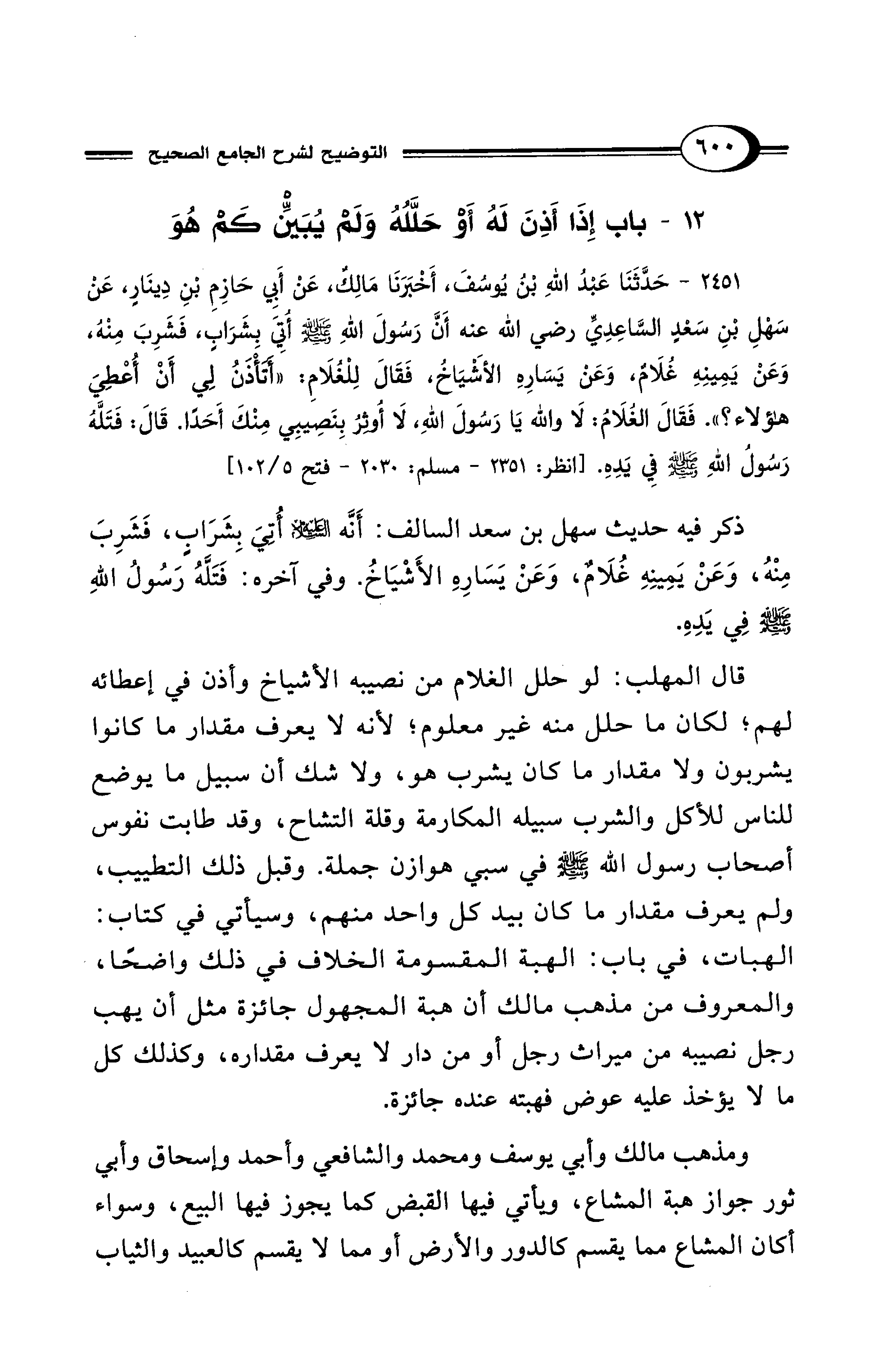 2451 - حَدَّثَنَا عَبْدُ اللهِ بْنُ يُوسُفَ، أَخْبَرَنَا مَالِكٌ، عَنْ أَبِي حَازِمِ بْنِ دِينَارٍ عَنْ سَهْلِ بْنِ سَعْدٍ السَّاعِدِيِّ رضي الله عنه أَنَّ رَسُولَ اللهِ - صلى الله عليه وسلم - أُتِيَ بِشَرَابٍ، فَشَرِبَ مِنْهُ، وَعَنْ يَمِينِهِ غُلاَمٌ، وَعَنْ يَسَارِهِ الأَشْيَاخُ، فَقَالَ لِلْغُلاَمِ: "أَتَأْذَنُ لِي أَنْ أُعْطِيَ هَؤُلاَءِ؟ ". فَقَالَ الغُلاَمُ: لَا وَاللهِ يَا رَسُولَ اللهِ، لَا أُوثِرُ بِنَصِيبِي مِنْكَ أَحَدًا. قَالَ: فَتَلَّهُ رَسُولُ اللهِ - صلى الله عليه وسلم - فِي يَدِهِ. [انظر: 2351 - مسلم: 2030 - فتح 5/ 102]