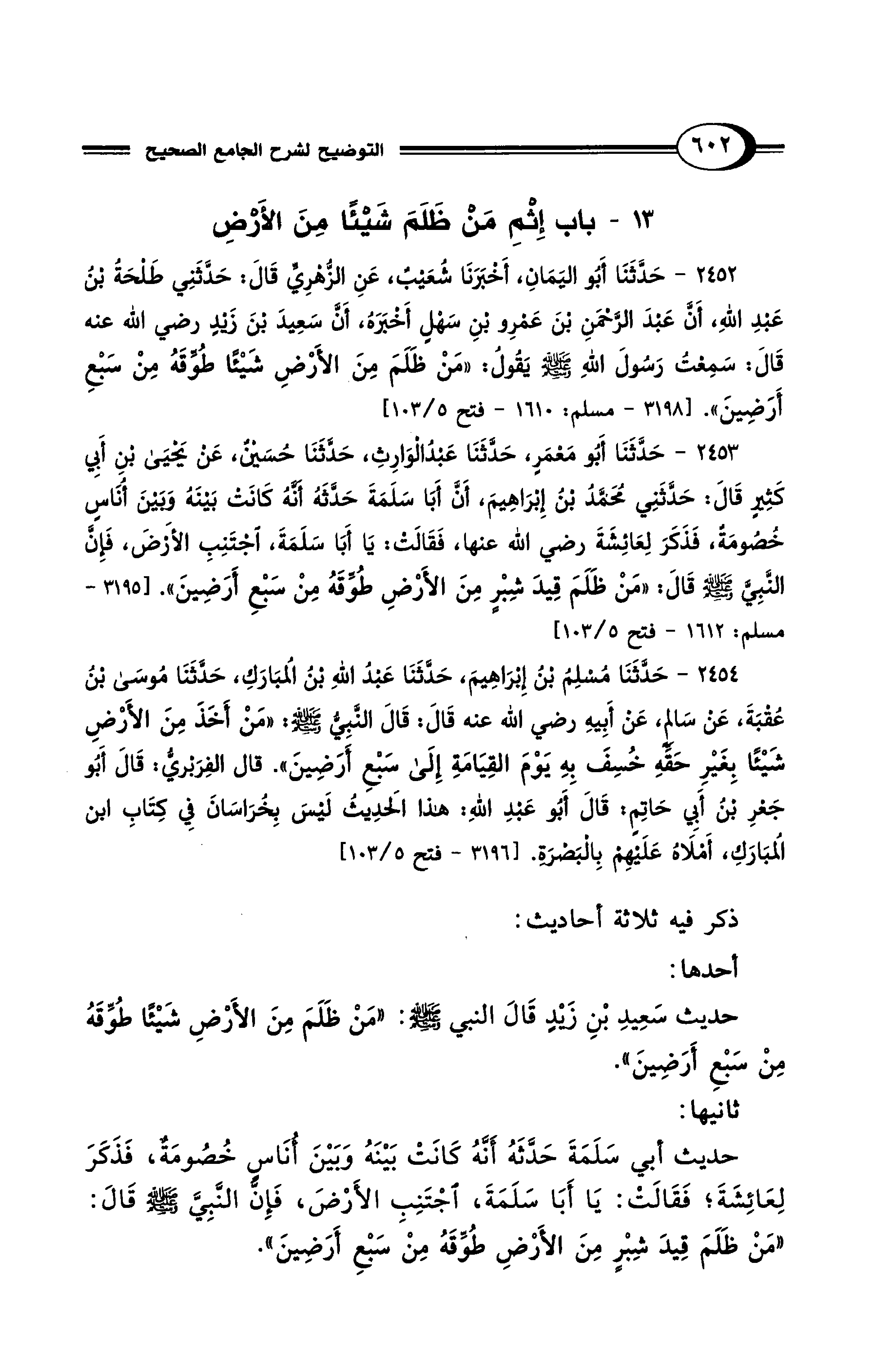 2453 - حَدَّثَنَا أَبُو مَعْمَرٍ، حَدَّثَنَا عَبْدُ الوَارِثِ، حَدَّثَنَا حُسَيْنٌ، عَنْ يَحْيَى بْنِ أَبِي كَثِيرٍ قَالَ: حَدَّثَنِي مُحَمَّدُ بْنُ إِبْرَاهِيمَ، أَنَّ أَبَا سَلَمَةَ حَدَّثَهُ أَنَّهُ كَانَتْ بَيْنَهُ وَبَيْنَ أُنَاسٍ خُصُومَةٌ، فَذَكَرَ لِعَائِشَةَ رضي الله عنها، فَقَالَتْ: يَا أَبَا سَلَمَةَ، اجْتَنِبِ الأَرْضَ، فَإِنَّ النَّبِيَّ - صلى الله عليه وسلم - قَالَ: "مَنْ ظَلَمَ قِيدَ شِبْرٍ مِنَ الأَرْضِ طُوِّقَهُ مِنْ سَبْعِ أَرَضِينَ". [3195 - مسلم: 1612 - فتح 5/ 103]