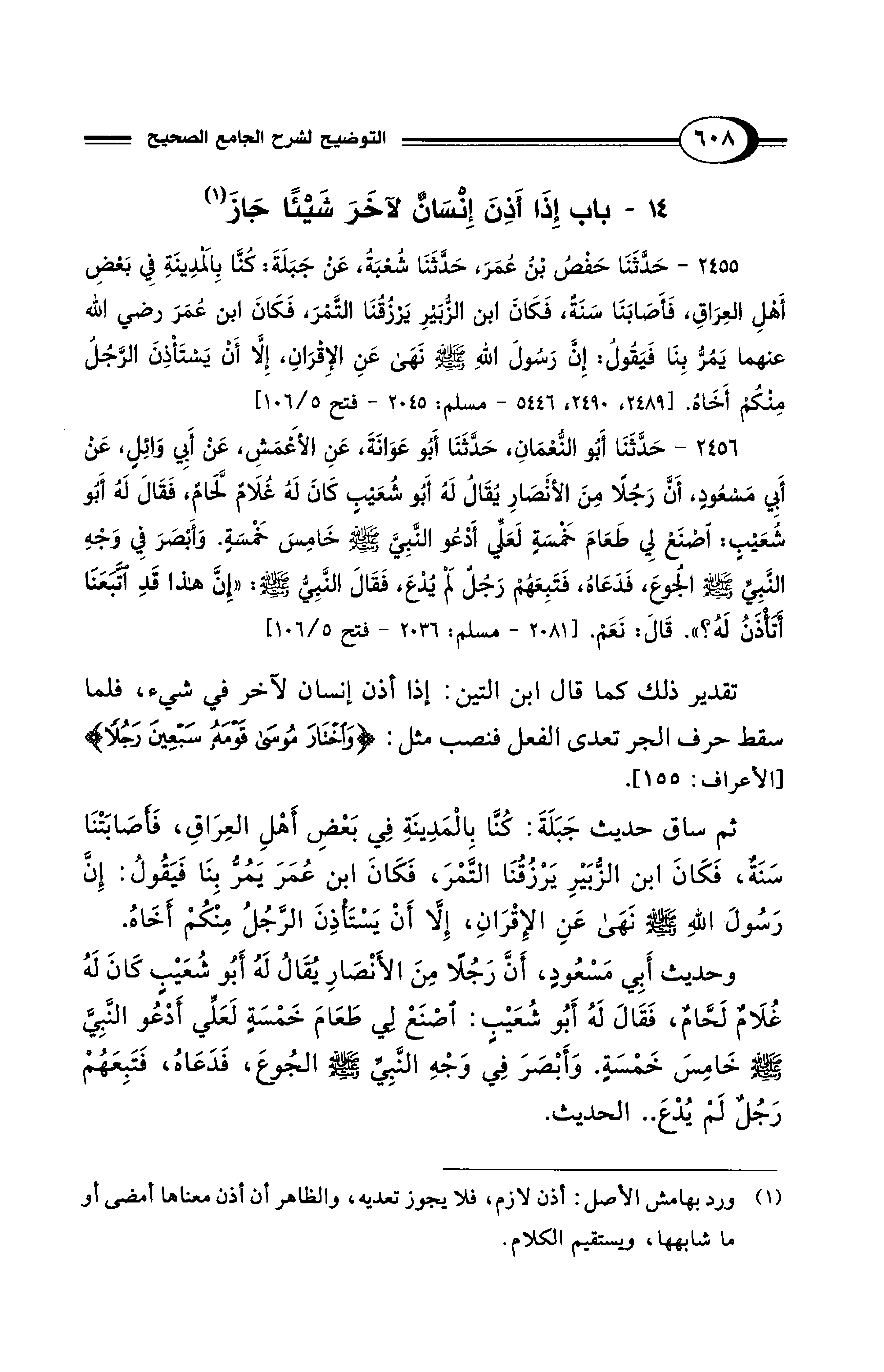 ثم ساق حديث جَبَلَةَ: كُنَّا بالمَدِينَةِ فِي بَعْضِ أَهْلِ العِرَاقِ، فَأصَابَتْنَا سَنَةٌ، فَكَانَ ابن الزُّبَيْرِ يَرْزُقُنَا التَّمْرَ، فَكَانَ ابن عُمَرَ يَمُرُّ بِنَا فَيَقُولُ: إِنَّ رَسُولَ اللهِ - صلى الله عليه وسلم - نَهَى عَنِ الإِقْرَانِ، إِلَّا أَنْ يَسْتَأْذِنَ الرَّجُلُ مِنْكُمْ أَخَاهُ.
