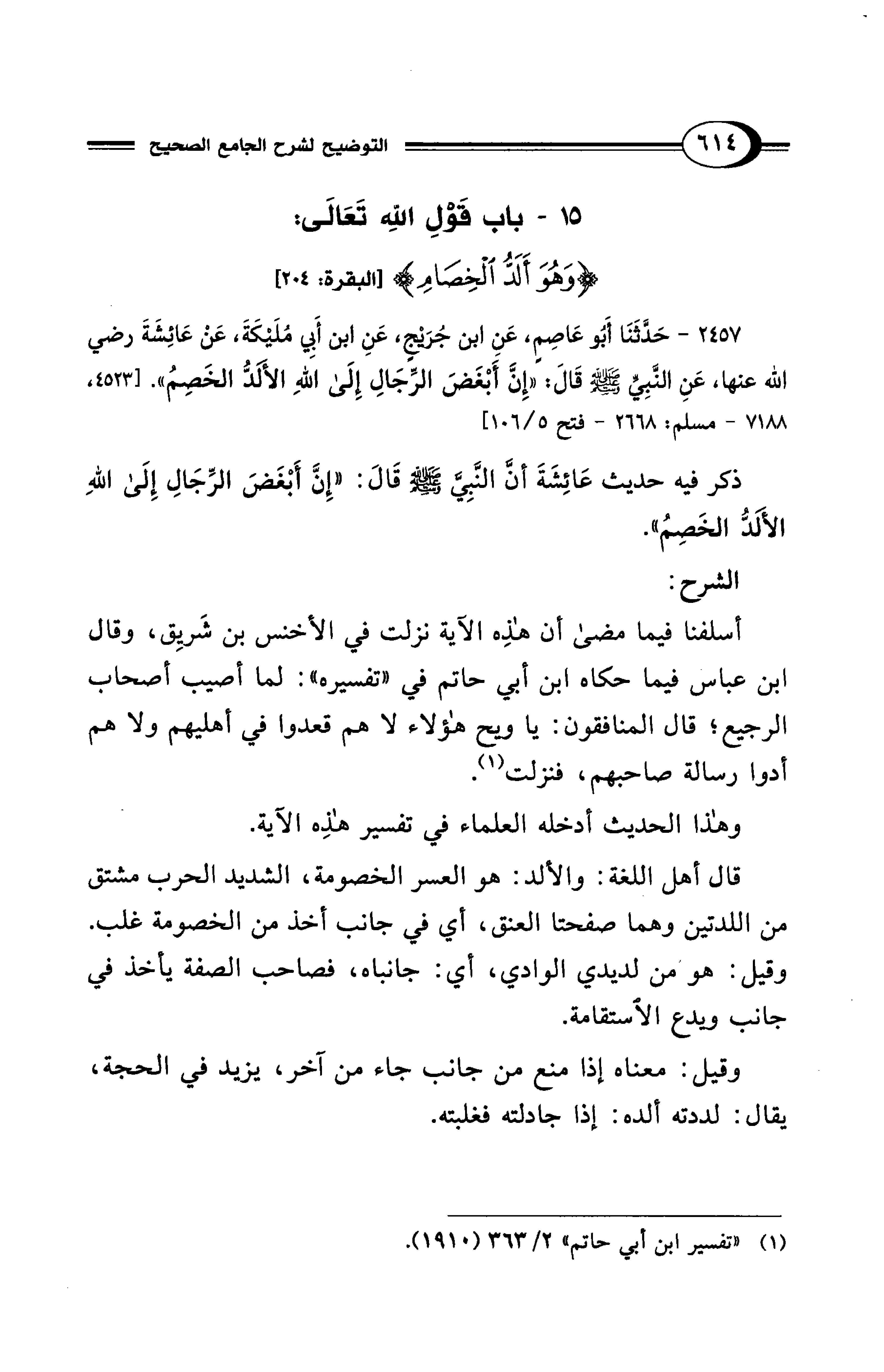 2457 - حَدَّثَنَا أَبُو عَاصِمٍ عَنِ ابْنِ جُرَيْجٍ، عَنِ ابْنِ أَبِي مُلَيْكَةَ، عَنْ عَائِشَةَ رضي الله عنها، عَنِ النَّبِيِّ - صلى الله عليه وسلم - قَالَ: "إِنَّ أَبْغَضَ الرِّجَالِ إِلَى اللهِ الأَلَدُّ الخَصِمُ". [4523، 7188 - مسلم: 2668 - فتح 5/ 106]