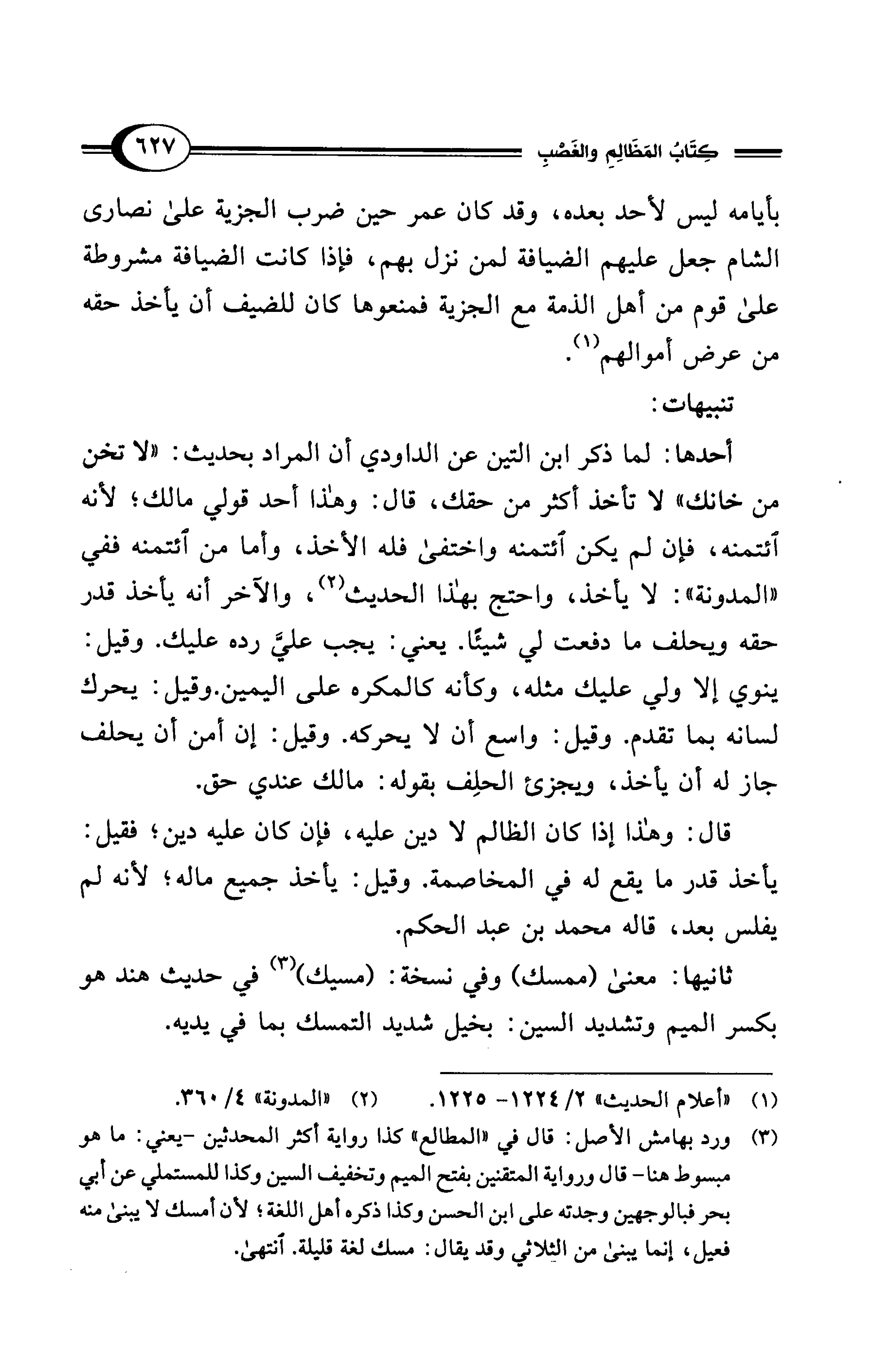 بأيامه ليس لأحد بعده، وقد كان عمر حين ضرب الجزية على نصارى الشام جعل عليهم الضيافة لمن نزل بهم، فإذا كانت الضيافة مشروطة على قوم من أهل الذمة مع الجزية فمنعوها كان للضيف أن يأخذ حقه من عرض أموالهم (¬1).