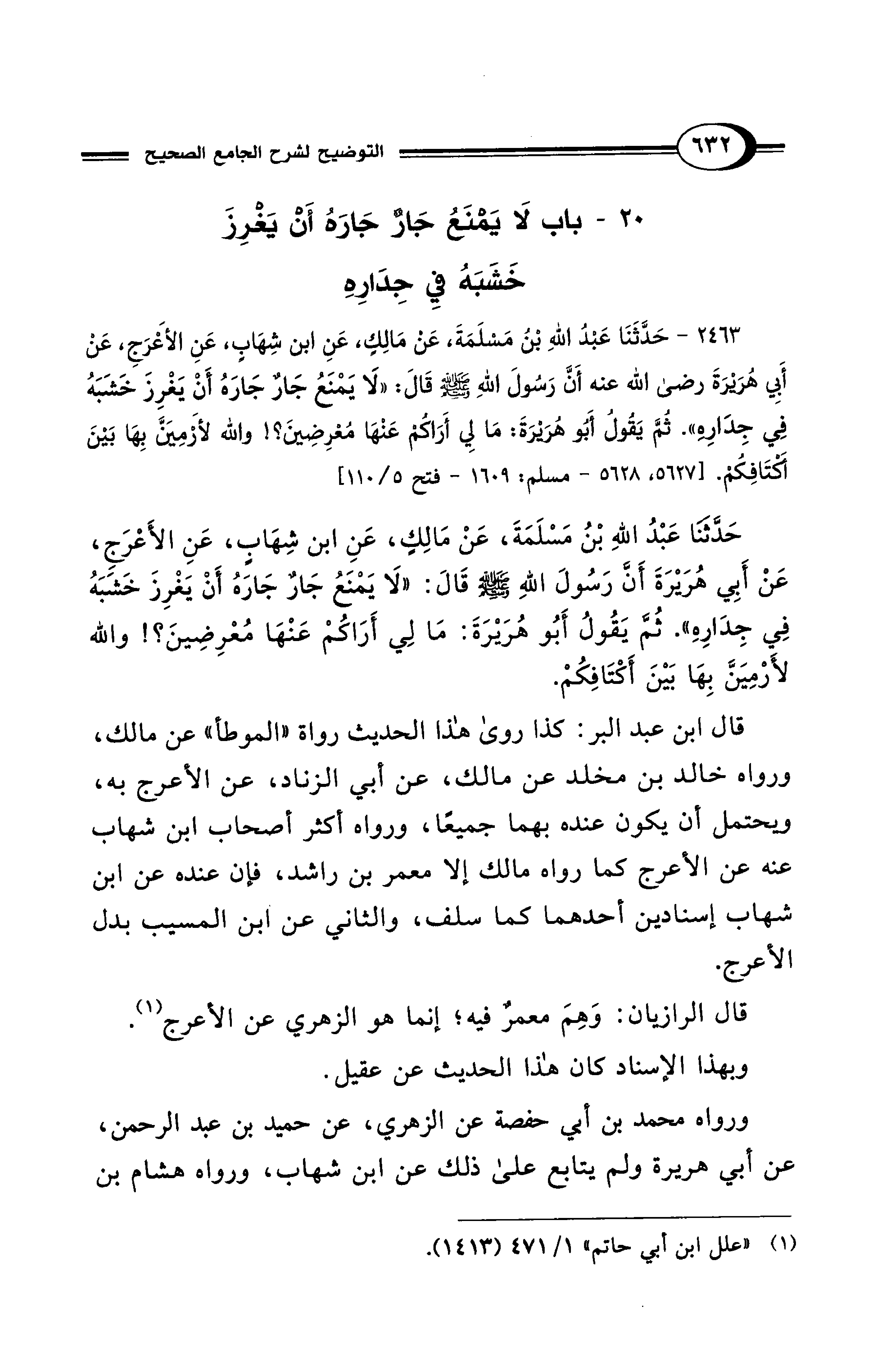 حَدَّثَنَا عَبْدُ اللهِ بْنُ مَسْلَمَةَ، عَنْ مَالِكٍ، عَنِ ابْنِ شِهَابٍ، عَنِ الأَعْرَجِ، عَنْ أَبِي هُرَيْرَةَ أَنَّ رَسُولَ اللهِ - صلى الله عليه وسلم - قَالَ: "لَا يَمْنَعُ جَارٌ جَارَهُ أَنْ يَغْرِزَ خَشَبَهُ فِي جِدَارِهِ". ثُمَّ يَقُولُ أَبُو هُرَيْرَةَ: مَا لِي أَرَاكُمْ عَنْهَا مُعْرِضِينَ؟! وَاللهِ لأَرْمِيَنَّ بِهَا بَيْنَ أَكْتَافِكُمْ.