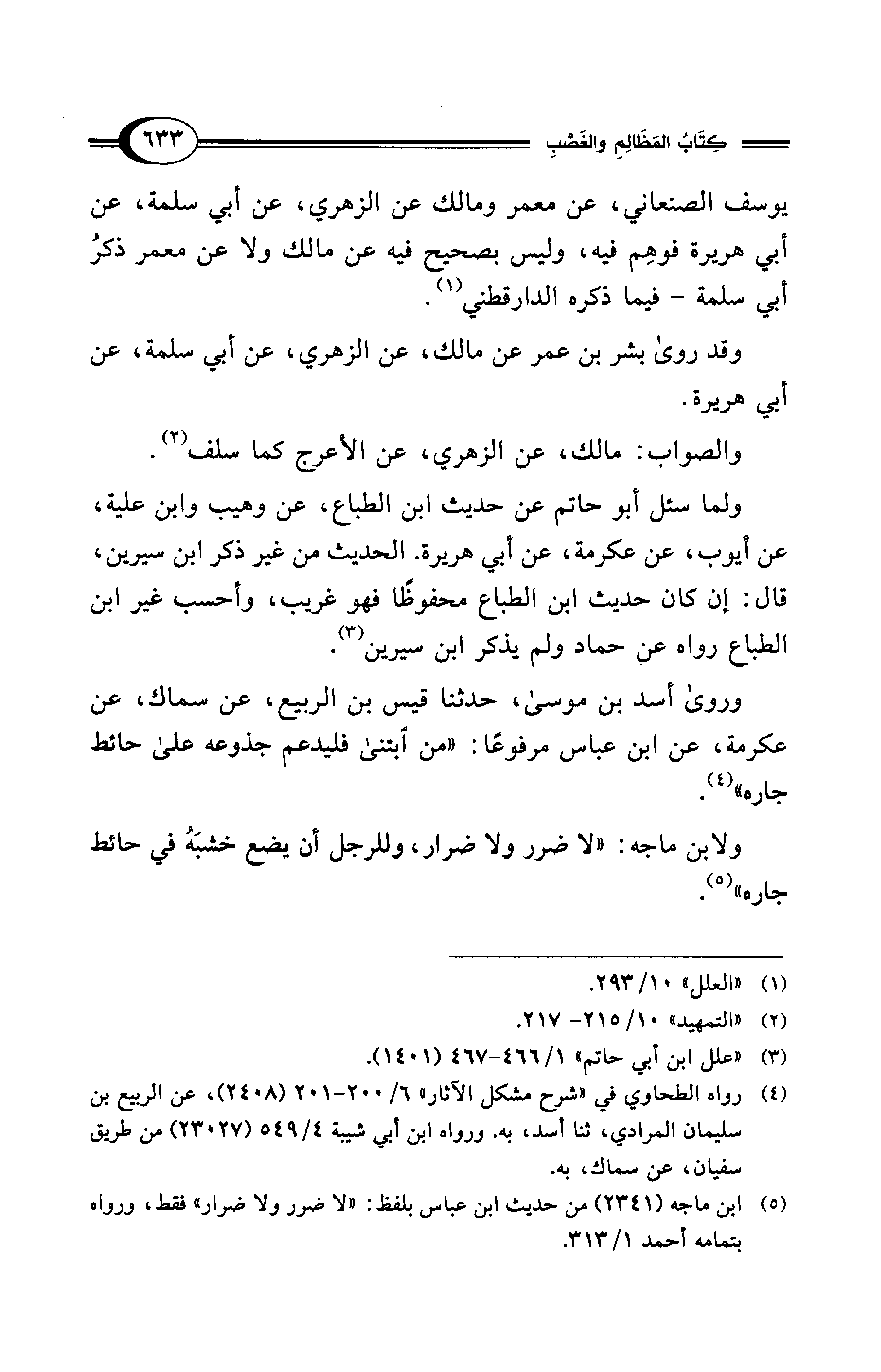 (¬5) ابن ماجه (2341) من حديث ابن عباس بلفظ: "لا ضرر ولا ضرار" فقط، ورواه بتمامه أحمد 1/ 313.