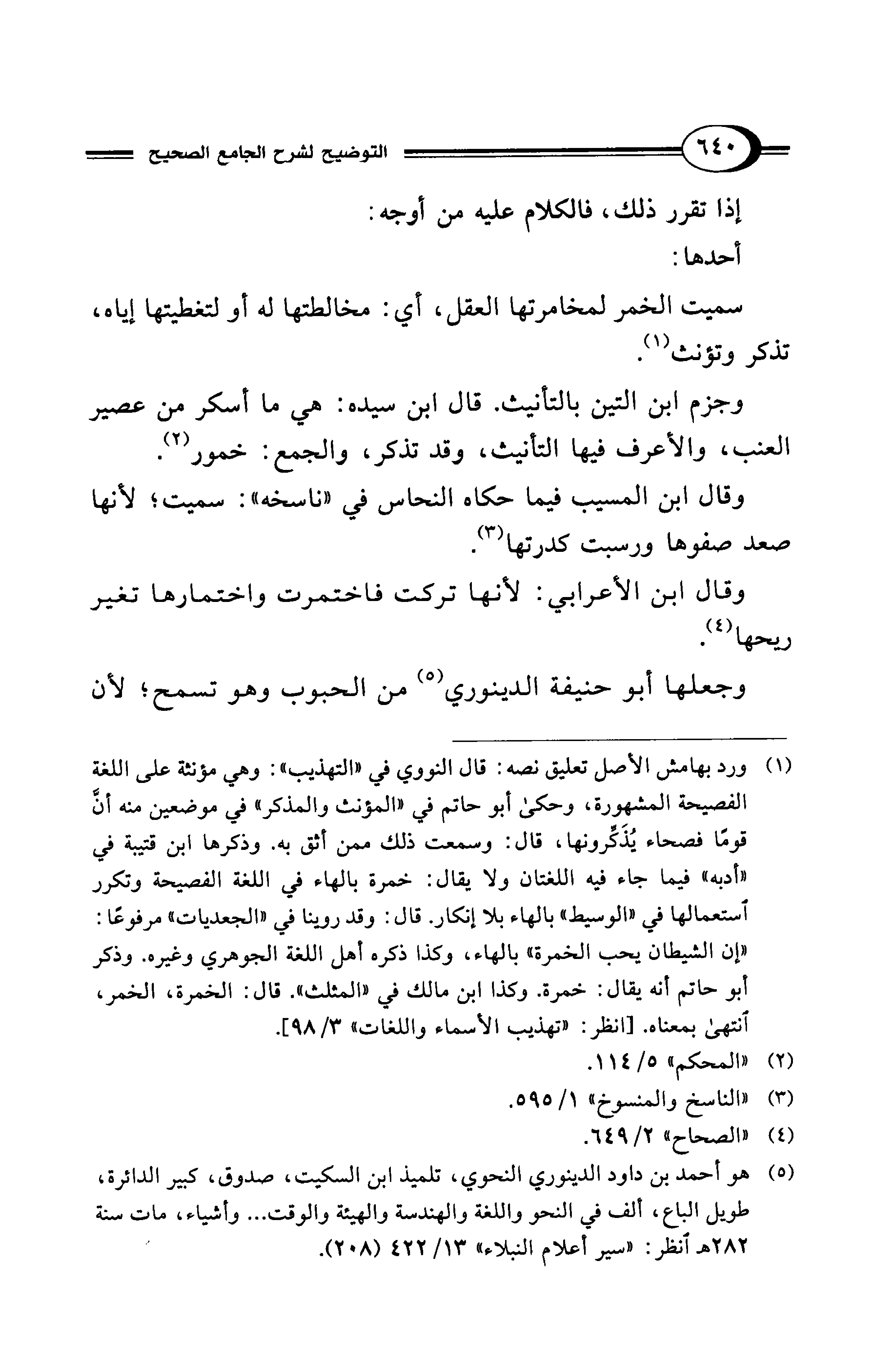 (¬5) هو أحمد بن داود الدينوري النحوي، تلميذ ابن السكيت، صدوق، كبير الدائرة، طويل الباع، ألف في النحو واللغة والهندسة والهيئة والوقت ... وأشياء، مات سنة 282 ص انظر: "سير أعلام النبلاء" 13/ 422 (208).