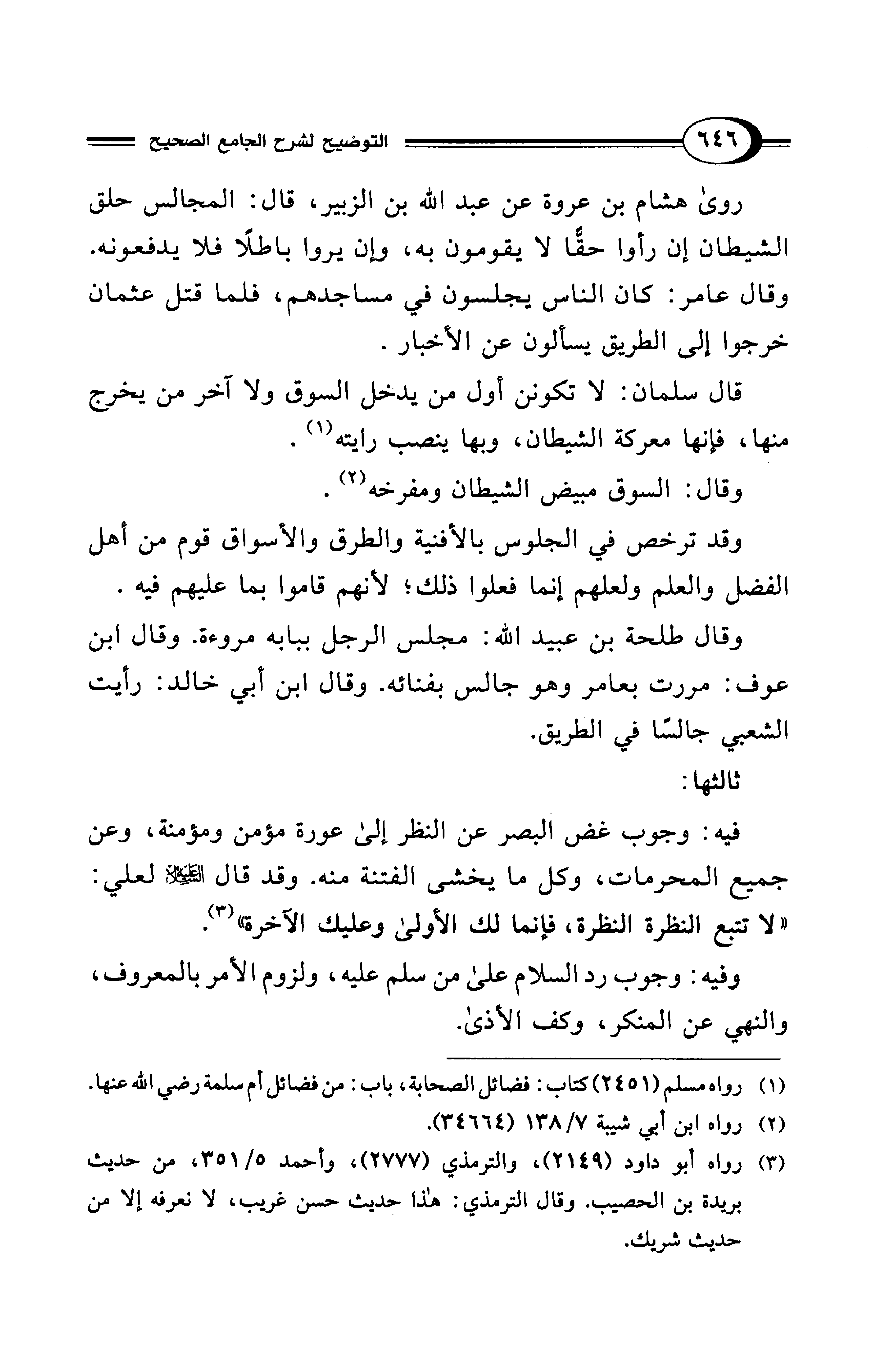 فيه: وجوب غض البصر عن النظر إلى عورة مؤمن ومؤمنة، وعن جميع المحرمات، وكل ما يخشى الفتنة منه. وقد قال - عليه السلام - لعلي: "لا تتبع النظرة النظرة، فإنما لك الأولى وعليك الآخرة" (¬3).