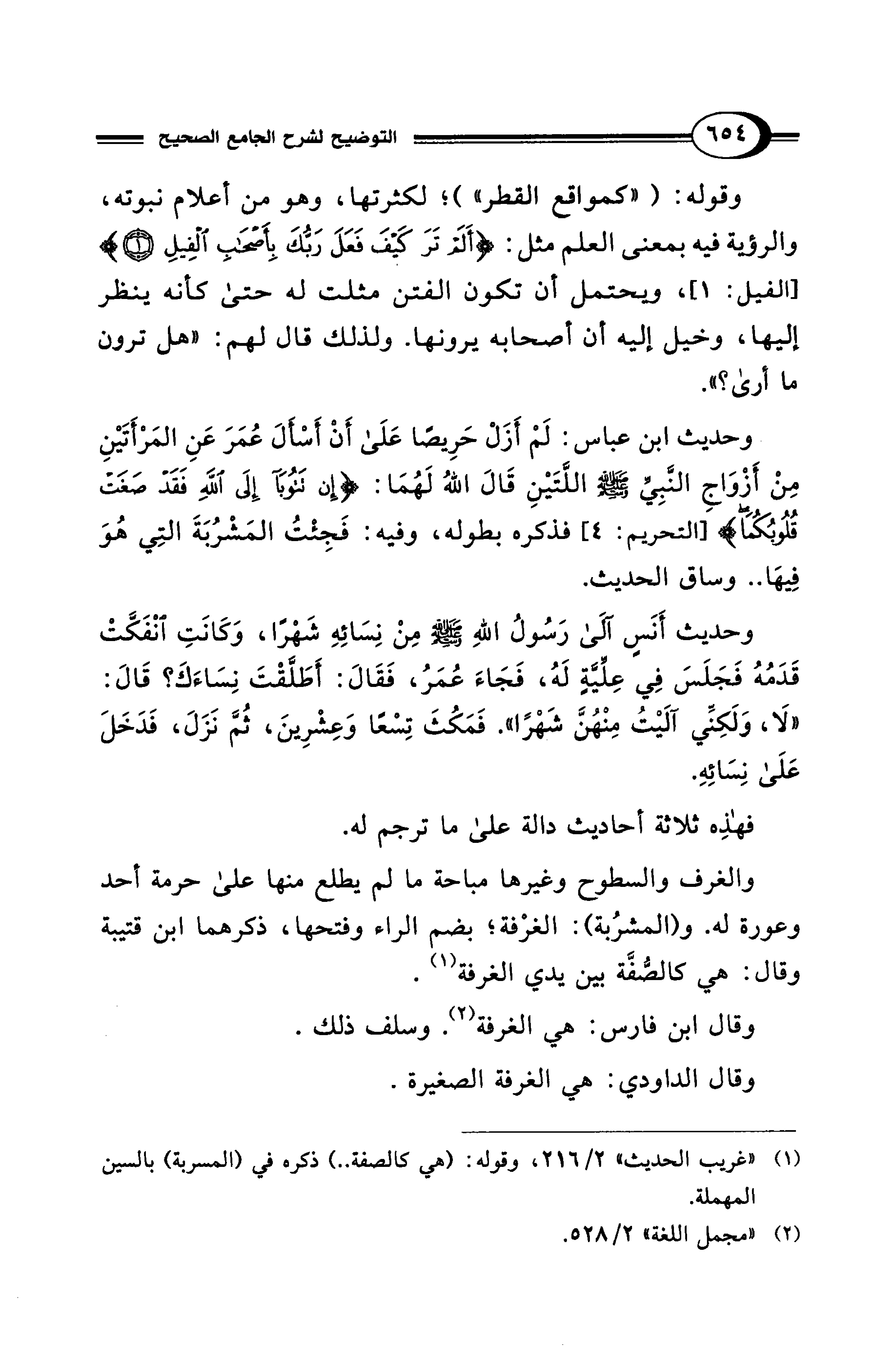 والغرف والسطوح وغيرها مباحة ما لم يطلع منها على حرمة أحد وعورة له. و (المشرُبة): الغرْفة؛ بضم الراء وفتحها، ذكرهما ابن قتيبة وقال: هي كالصُّفَّة بين يدي الغرفة (¬1).