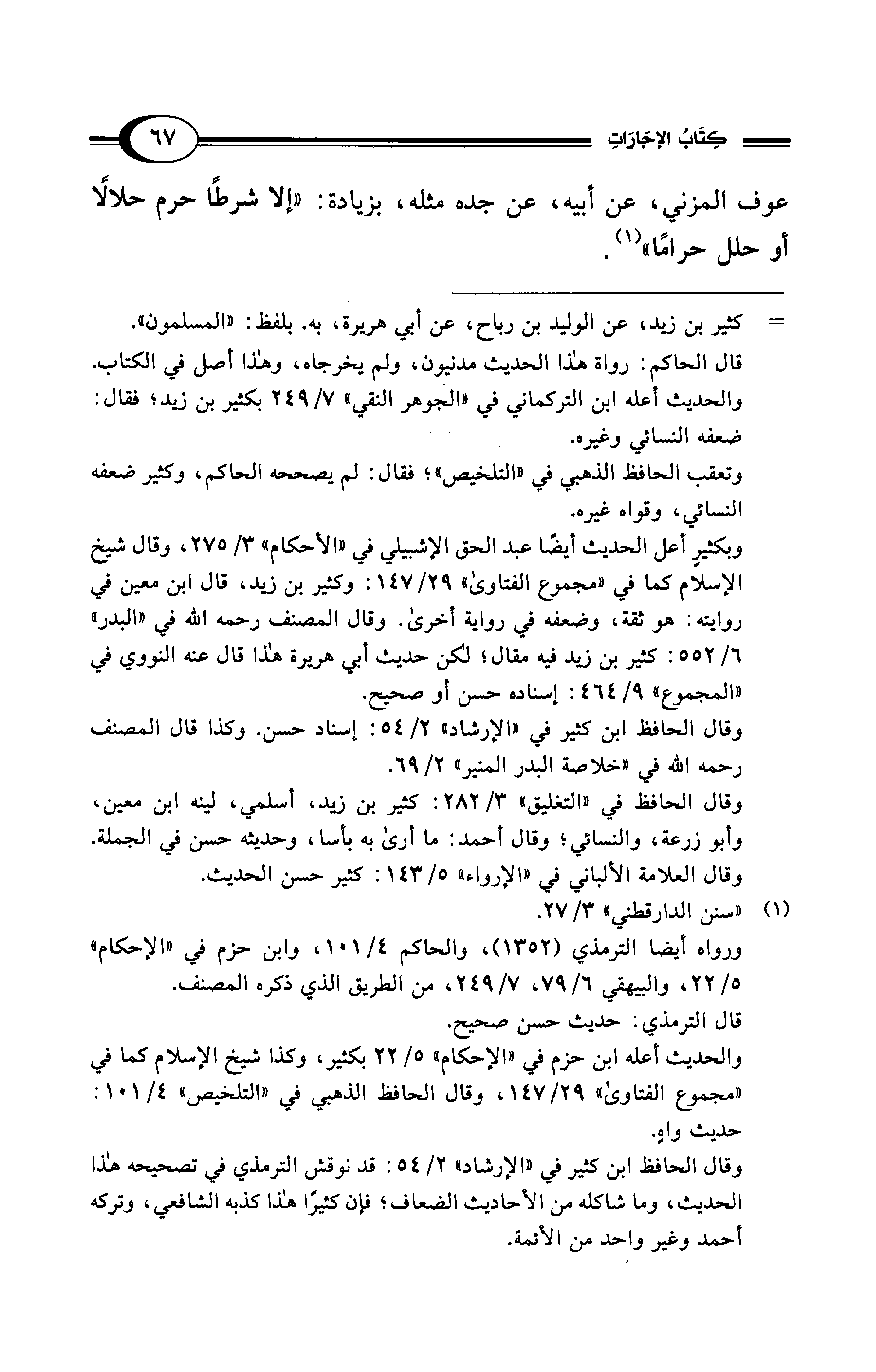 وبكثيرٍ أعل الحديث أيضًا عبد الحق الإشبيلي في "الأحكام" 3/ 275، وقال شيخ الإسلام كما في "مجموع الفتاوى" 29/ 147: وكثير بن زيد، قال ابن معين في روايته: هو ثقة، وضعفه في رواية أخرى. وقال المصنف رحمه الله في "البدر" 6/ 552: كثير بن زيد فيه مقال؛ لكن حديث أبي هريرة هذا قال عنه النووي في "المجموع" 9/ 464: إسناده حسن أو صحيح.