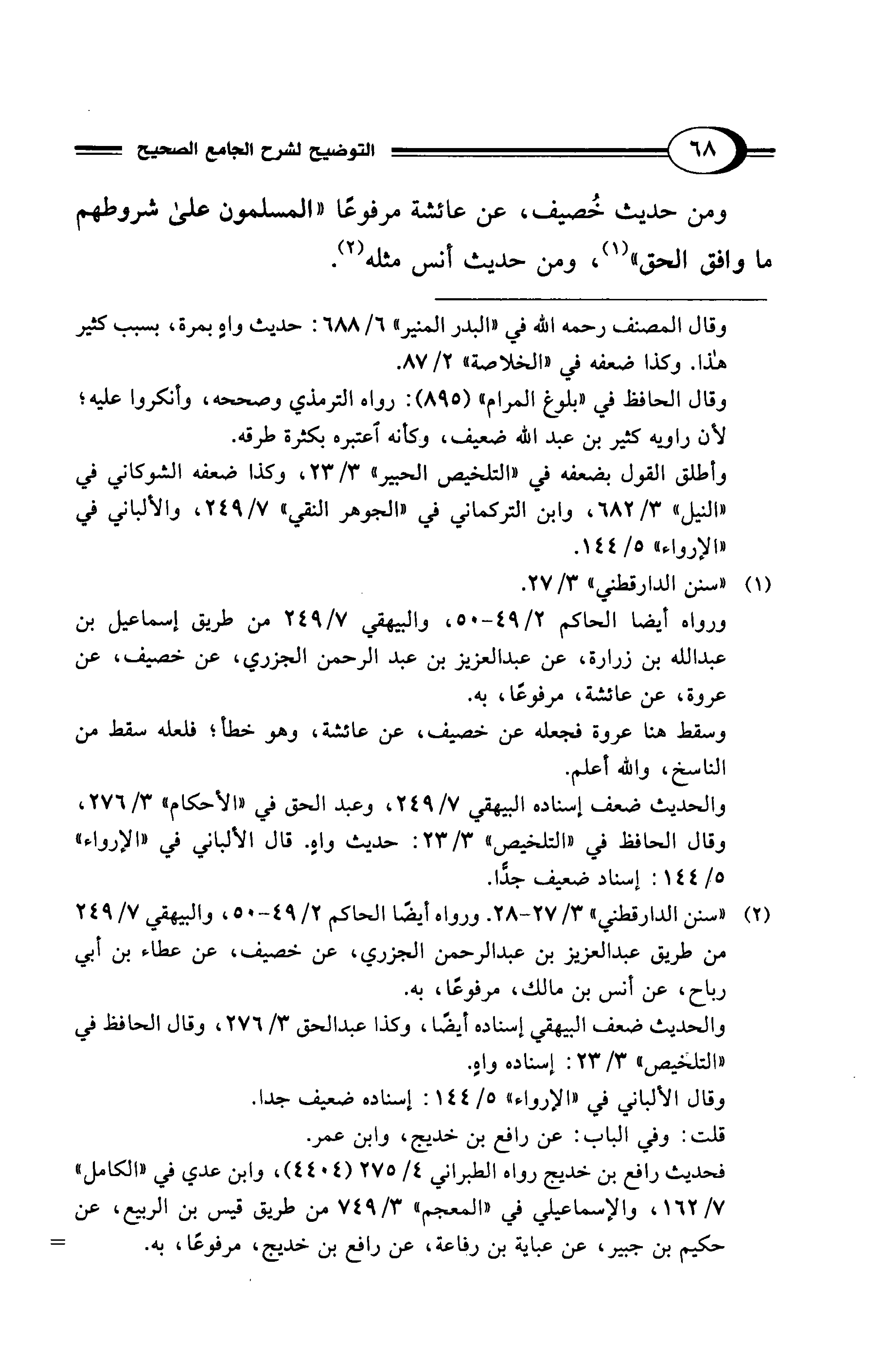 ومن حديث خُصيف، عن عائشة مرفوعًا "المسلمون على شروطهم ما وافق الحق" (¬1)، ومن حديث أنس مثله (¬2).