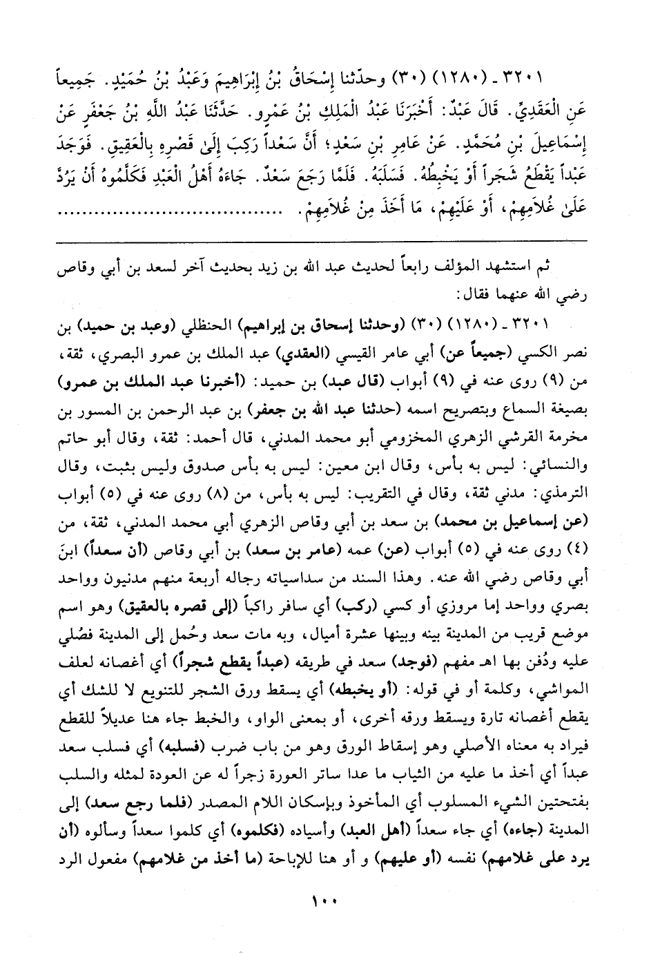 ٣٢٠١ - (١٢٨٠) (٣٠) وحدّثنا إِسْحَاقُ بْنُ إِبْرَاهِيمَ وَعَبْدُ بْنُ حُمَيدٍ. جَمِيعًا عَنِ الْعَقَدِيِّ. قَال عَبْدٌ: أَخْبَرَنَا عَبْدُ الْمَلِكِ بْنُ عَمرٍو. حدَّثَنَا عَبْدُ الله بْنُ جَعْفَرِ عَنْ إِسْمَاعِيلَ بْنِ مُحَمَّدٍ. عَنْ عَامِرِ بْنِ سَعْدٍ؛ أَنَّ سَعْدًا رَكِبَ إِلَى قَصْرِهِ بِالْعَقِيقِ. فَوَجَدَ عَبْدًا يَقْطَعُ شَجَرًا أَوْ يَخْبِطُهُ. فَسَلَبَهُ. فَلَمَّا رَجَعَ سَعْدٌ. جَاءَهُ أَهْلُ الْعَبْدِ فَكَلَّمُوهُ أَنْ يَرُدَّ عَلَى غُلامِهِمْ، أَوْ عَلَيهِم، مَا أَخَذَ مِنْ غُلامِهِمْ