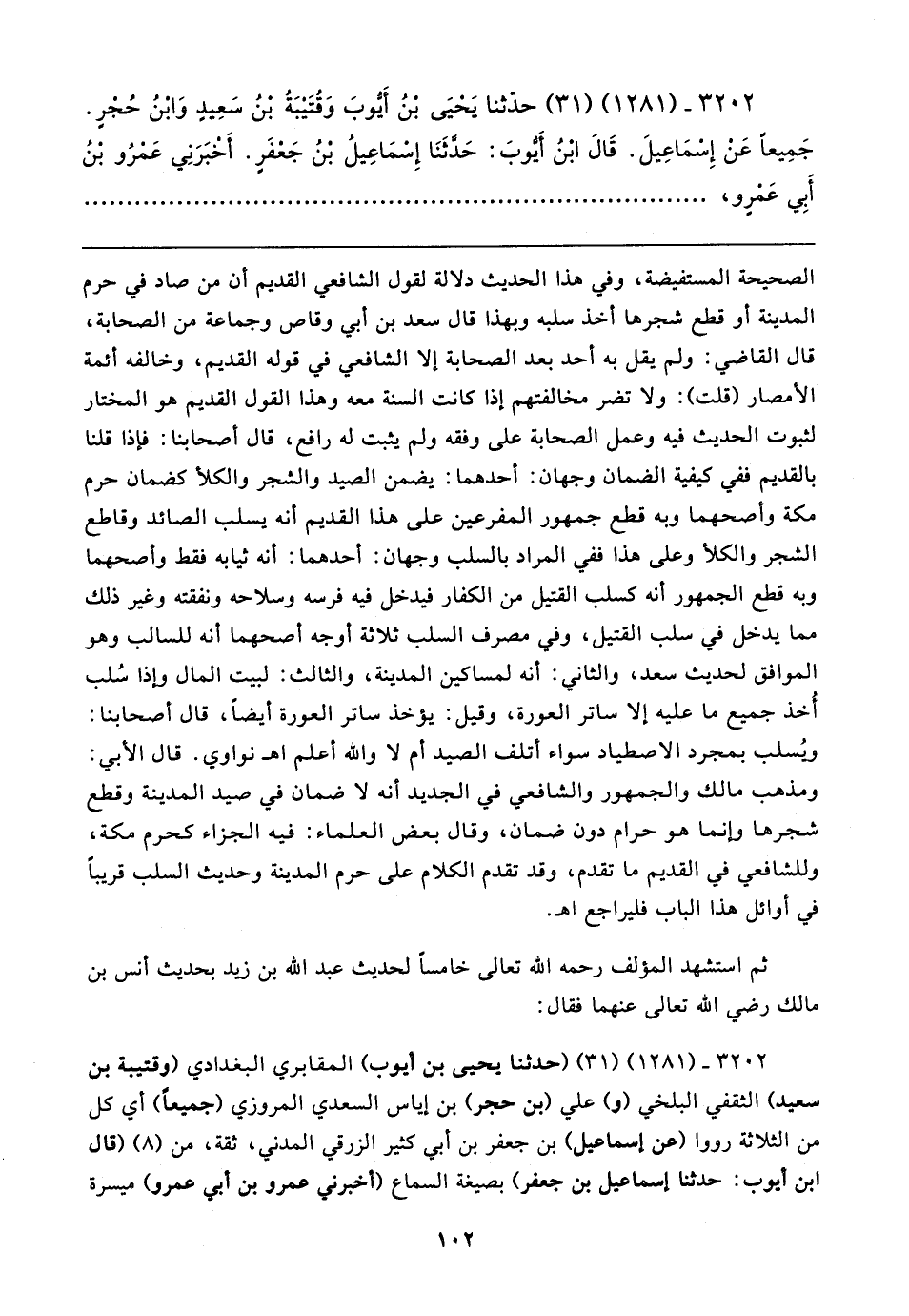 الصحيحة المستفيضة، وفي هذا الحديث دلالة لقول الشافعي القديم أن من صاد في حرم المدينة أو قطع شجرها أخذ سلبه وبهذا قال سعد بن أبي وقاص وجماعة من الصحابة، قال القاضي: ولم يقل به أحد بعد الصحابة إلا الشافعي في قوله القديم، وخالفه أئمة الأمصار (قلت): ولا تضر مخالفتهم إذا كانت السنة معه وهذا القول القديم هو المختار لثبوت الحديث فيه وعمل الصحابة على وفقه ولم يثبت له رافع، قال أصحابنا: فإذا قلنا بالقديم ففي كيفية الضمان وجهان: أحدهما: يضمن الصيد والشجر والكلأ كضمان حرم مكة وأصحهما وبه قطع جمهور المفرعين على هذا القديم أنه يسلب الصائد وقاطع الشجر والكلأ وعلى هذا ففي المراد بالسلب وجهان: أحدهما: أنه ثيابه فقط وأصحهما وبه قطع الجمهور أنه كسلب القتيل من الكفار فيدخل فيه فرسه وسلاحه ونفقته وغير ذلك مما يدخل في سلب القتيل، وفي مصرف السلب ثلاثة أوجه أصحهما أنه للسالب وهو الموافق لحديث سعد، والثاني: أنه لمساكين المدينة، والثالث: لبيت المال وإذا سُلب أُخذ جميع ما عليه إلا ساتر العورة، وقيل: يؤخذ ساتر العورة أيضًا، قال أصحابنا: ويُسلب بمجرد الاصطياد سواء أتلف الصيد أم لا والله أعلم اهـ نواوي. قال الأبي: ومذهب مالك والجمهور والشافعي في الجديد أنه لا ضمان في صيد المدينة وقطع شجرها وإنما هو حرام دون ضمان، وقال بعض العلماء: فيه الجزاء كحرم مكة، وللشافعي في القديم ما تقدم، وقد تقدم الكلام على حرم المدينة وحديث السلب قريبًا في أوائل هذا الباب فليراجع اهـ.