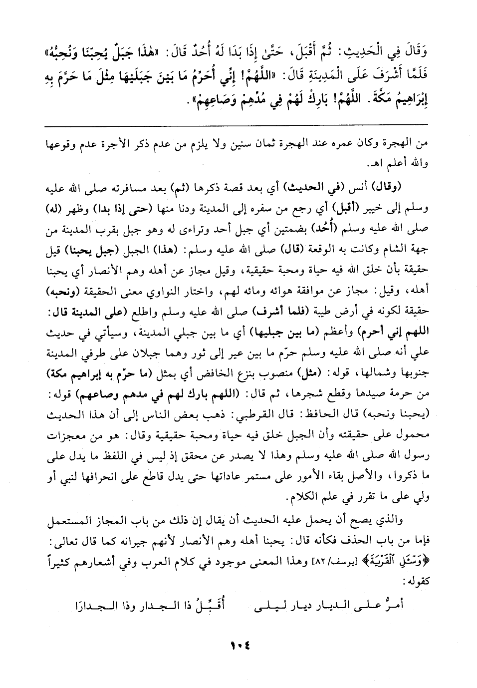 (وقال) أنس (في الحديث) أي بعد قصة ذكرها (ثم) بعد مسافرته صلى الله عليه وسلم إلى خيبر (أقبل) أي رجع من سفره إلى المدينة ودنا منها (حتى إذا بدا) وظهر (له) صلى الله عليه وسلم (أُحُد) بضمتين أي جبل أحد وتراءى له وهو جبل بقرب المدينة من جهة الشام وكانت به الوقعة (قال) صلى الله عليه وسلم: (هذا) الجبل (جبل يحبنا) قيل حقيقة بأن خلق الله فيه حياة ومحبة حقيقية، وقيل مجاز عن أهله وهم الأنصار أي يحبنا أهله، وقيل: مجاز عن موافقة هوائه ومائه لهم، واختار النواوي معنى الحقيقة (ونحبه) حقيقة لكونه في أرض طيبة (فلما أشرف) صلى الله عليه وسلم واطلع (على المدينة قال: اللهم إني أحرم) وأعظم (ما بين جبليها) أي ما بين جبلي المدينة، وسيأتي في حديث علي أنه صلى الله عليه وسلم حرّم ما بين عير إلى ثور وهما جبلان على طرفي المدينة جنوبها وشمالها، قوله: (مثل) منصوب بنزع الخافض أي بمثل (ما حرّم به إبراهيم مكة) من حرمة صيدها وقطع شجرها، ثم قال: (اللهم بارك لهم في مدهم وصاعهم) قوله: (يحبنا ونحبه) قال الحافظ: قال القرطبي: ذهب بعض الناس إلى أن هذا الحديث محمول على حقيقته وأن الجبل خلق فيه حياة ومحبة حقيقية وقال: هو من معجزات رسول الله صلى الله عليه وسلم وهذا لا يصدر عن محقق إذ ليس في اللفظ ما يدل على ما ذكروا، والأصل بقاء الأمور على مستمر عاداتها حتى يدل قاطع على انحرافها لنبي أو ولي على ما تقرر في علم الكلام.