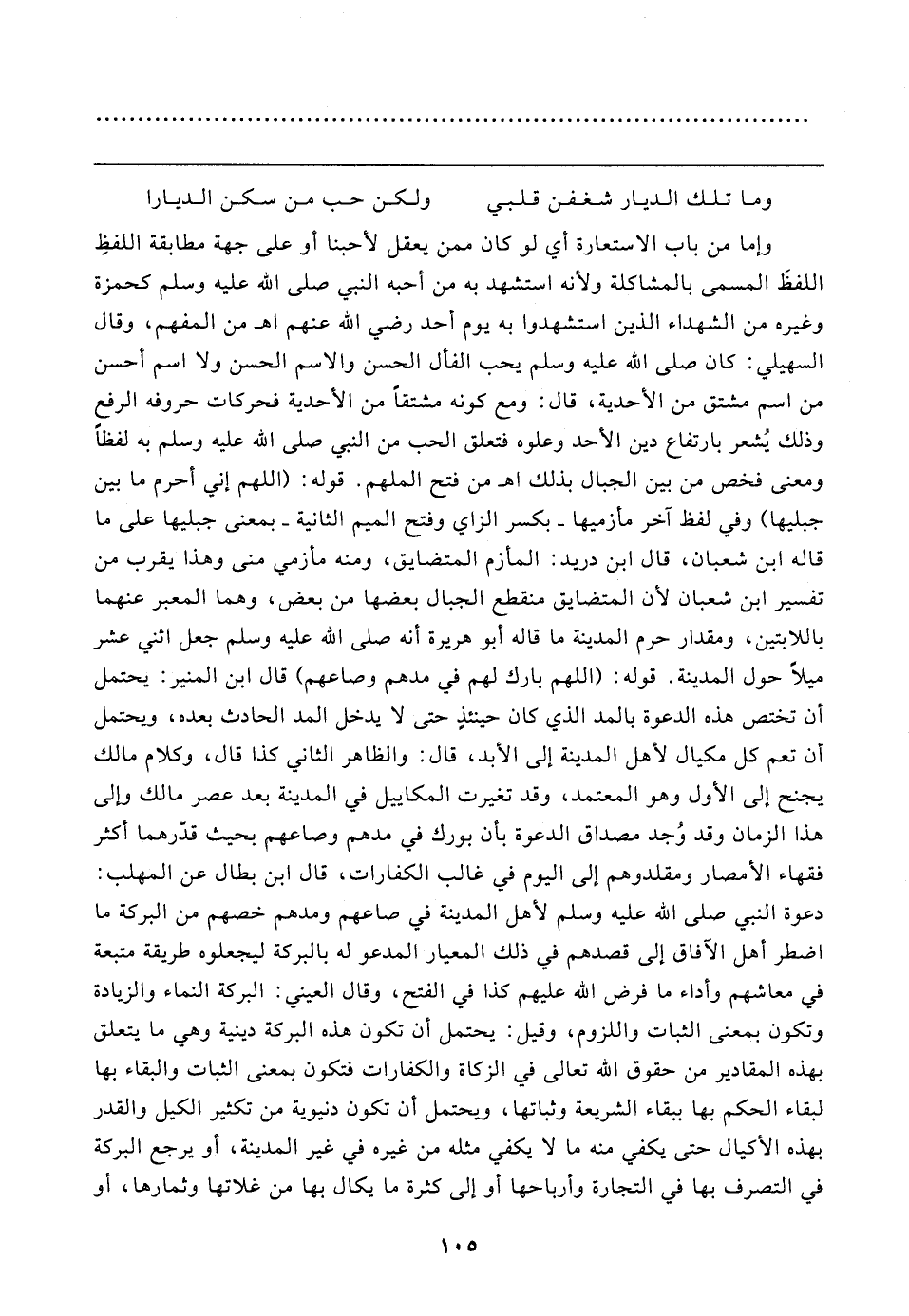 وإما من باب الاستعارة أي لو كان ممن يعقل لأحبنا أو على جهة مطابقة اللفظِ اللفظَ المسمى بالمشاكلة ولأنه استشهد به من أحبه النبي صلى الله عليه وسلم كحمزة وغيره من الشهداء الذين استشهدوا به يوم أحد رضي الله عنهم اهـ من المفهم، وقال السهيلي: كان صلى الله عليه وسلم يحب الفأل الحسن والاسم الحسن ولا اسم أحسن من اسم مشتق من الأحدية، قال: ومع كونه مشتقًا من الأحدية فحركات حروفه الرفع وذلك يُشعر بارتفاع دين الأحد وعلوه فتعلق الحب من النبي صلى الله عليه وسلم به لفظًا ومعنى فخص من بين الجبال بذلك اهـ من فتح الملهم. قوله: (اللهم إني أحرم ما بين جبليها) وفي لفظ آخر مأزميها -بكسر الزاي وفتح الميم الثانية- بمعنى جبليها على ما قاله ابن شعبان، قال ابن دريد: المأزم المتضايق، ومنه مأزمي منى وهذا يقرب من تفسير ابن شعبان لأن المتضايق منقطع الجبال بعضها من بعض، وهما المعبر عنهما باللابتين، ومقدار حرم المدينة ما قاله أبو هريرة أنه صلى الله عليه وسلم جعل اثني عشر ميلًا حول المدينة. قوله: (اللهم بارك لهم في مدهم وصاعهم) قال ابن المنير: يحتمل أن تختص هذه الدعوة بالمد الذي كان حينئذٍ حتى لا يدخل المد الحادث بعده، ويحتمل أن تعم كل مكيال لأهل المدينة إلى الأبد، قال: والظاهر الثاني كذا قال، وكلام مالك يجنح إلى الأول وهو المعتمد، وقد تغيرت المكاييل في المدينة بعد عصر مالك وإلى هذا الزمان وقد وُجد مصداق الدعوة بأن بورك في مدهم وصاعهم بحيث قدّرهما أكثر فقهاء الأمصار ومقلدوهم إلى اليوم في غالب الكفارات، قال ابن بطال عن المهلب: دعوة النبي صلى الله عليه وسلم لأهل المدينة في صاعهم ومدهم خصهم من البركة ما اضطر أهل الآفاق إلى قصدهم في ذلك المعيار المدعو له بالبركة ليجعلوه طريقة متبعة في معاشهم وأداء ما فرض الله عليهم كذا في الفتح، وقال العيني: البركة النماء والزيادة وتكون بمعنى الثبات واللزوم، وقيل: يحتمل أن تكون هذه البركة دينية وهي ما يتعلق بهذه المقادير من حقوق الله تعالى في الزكاة والكفارات فتكون بمعنى الثبات والبقاء بها لبقاء الحكم بها ببقاء الشريعة وثباتها، ويحتمل أن تكون دنيوية من تكثير الكيل والقدر بهذه الأكيال حتى يكفي منه ما لا يكفي مثله من غيره في غير المدينة، أو يرجع البركة في التصرف بها في التجارة وأرباحها أو إلى كثرة ما يكال بها من غلاتها وثمارها، أو