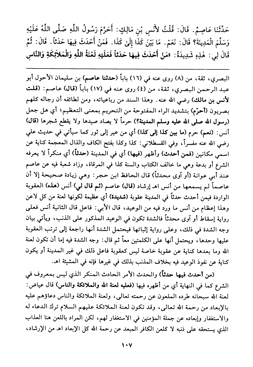 البصري، ثقة، من (٨) روى عنه في (١٦) بابا (حدثنا عاصم) بن سليمان الأحول أبو عبد الرحمن البصري، ثقة، من (٤) روى عنه في (١٧) بابا (قال) عاصم: (قلت لأنس بن مالك) رضي الله عنه. وهذا السند من رباعياته، ومن لطائفه أن رجاله كلهم بصريون (أحرّم) بتشديد الراء المفتوحة من التحريم بمعنى التعظيم؛ أي هل جعل (رسول الله صلى الله عليه وسلم المدينة؟ ) حرمًا لا يصاد صيدها ولا يقطع شجرها (قال) أنس: (نعم) حرم (ما بين كذا إلى كذا) أي من عير إلى ثور كما سيأتي في حديث علي رضي الله عنه مفسرًا، وفي القسطلاني: كذا وكذا بفتح الكاف والذال المعجمة كناية عن اسمي مكانين (فمن أحدث) وأظهر (فيها) أي في المدينة (حدثًا) أي منكرًا لا يعرفه الشرع أو بدعة وهي ما خالف الكتاب والسنة كذا في المرقاة، وزاد شعبة فيه عن عاصم عند أبي عوانة (أو آوى محدثًا) قال الحافظ ابن حجر: وهي زيادة صحيحة إلا أن عاصمًا لم يسمعها من أنس اهـ إرشاد (قال) عاصم (ثم قال لي) أنس (هذه) العقوبة الواردة فيمن أحدث حدثًا في المدينة عقوبة (شديدة) أي عظيمة لكونها لعنة من كل لاعن وهذا إعظام من أنس ما ورد فيه من الوعيد، قال الأبي: فاعل قال الثانية أنس فعلى رواية إسقاط أو آوى محدثًا فالشدة تكون في الوعيد المذكور على الذنب، ويأتي بيان وجه الشدة في ذلك، وعلى رواية إثباتها فيحتمل الشدة أنها راجعة إلى ترتب العقوبة عليها وحدها، ويحتمل أنها على الكلمتين معًا ثم قال: وجه الشدة فيه إما أن تكون لعنة الله وما بعدها كناية عن عقوبة خاصة ليس كعقوبة فاعل ذلك في غير المدينة أو يكون كناية عن نفوذ الوعيد فيه بخلاف المذنب بذلك في غيرها فإنه في المشيئة اهـ.