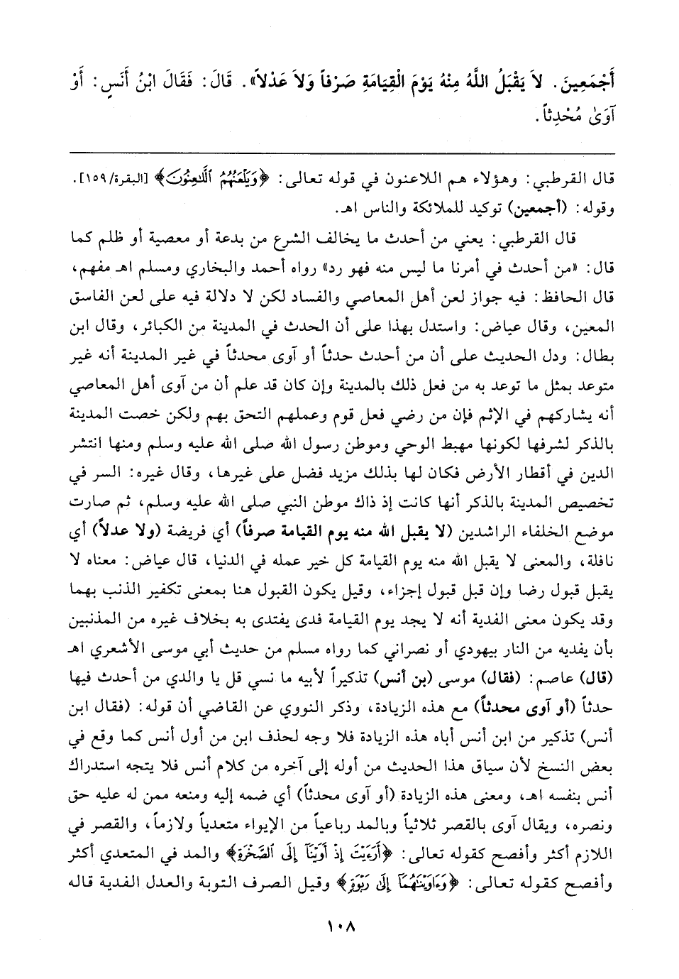 أَجْمَعِينَ. لَا يَقْبَلُ الله مِنْهُ يَوْمَ الْقِيَامَةِ صرْفًا وَلَا عَدْلًا".قَال: فَقَال ابْنُ أَنَسٍ: أَوْ آوَى مُحْدِثًا