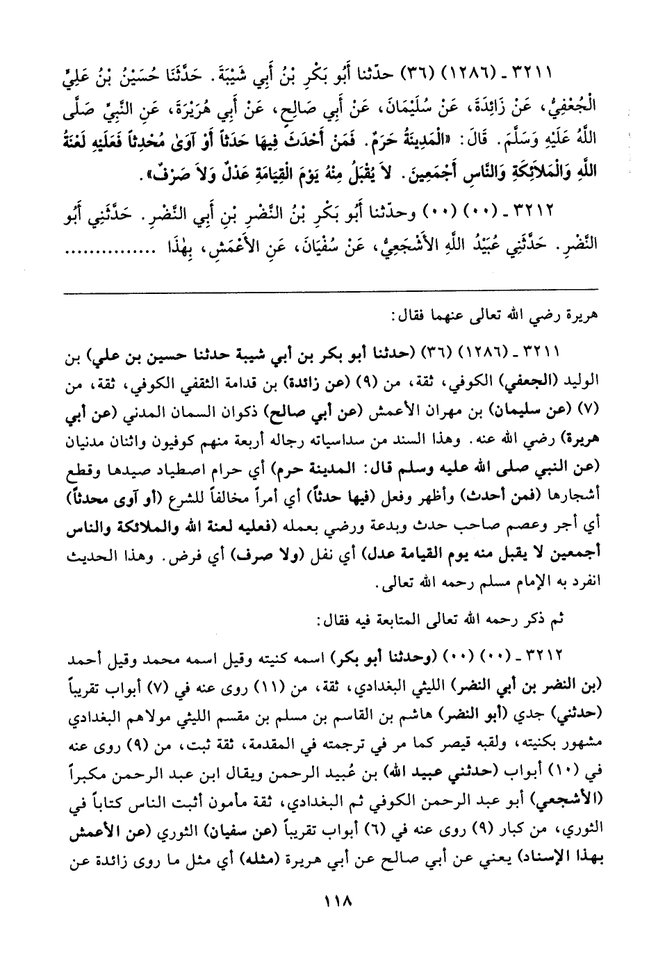 ٣٢١١ - (١٢٨٦) (٣٦) حدَّثنا أَبُو بَكرِ بْنُ أَبِي شَيبَةَ. حَدَّثَنَا حُسَينُ بْنُ عَلِيٍّ الْجُعفِيُّ، عَنْ زَائِدَةَ، عن سُلَيمَانَ، عن أَبِي صَالِحٍ، عن أَبِي هُرَيرَةَ، عَنِ النَّبِيّ صَلى الله عَلَيهِ وَسلمَ. قَال: "المَدِينَةُ حَرَمٌ. فَمَنْ أَحدَثَ فِيها حَدَثا أَوْ آوَى مُحدِثا فَعَلَيهِ لعنَةُ الله وَالمَلائكَةِ وَالناسِ أَجمَعِينَ. لَا يُقبَلُ مِتهُ يَومَ القِيَامَةِ عَدلٌ وَلَا صَرفٌ".