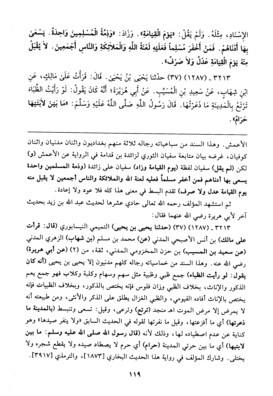 ٣٢١٣ - (١٢٨٧) (٣٧) حدثنا يَحيَى بْنُ يَحيَى. قَال: قَرَأْتُ عَلَى مَالك، عَنِ ابْنِ شِهاب، عَنْ سَعِيدِ بْنِ الْمُسَيَّبِ. عَنْ أبِي هُرَيرَةَ؛ أَنهُ كَانَ يَقُولُ: لَوْ رَأَيتُ الظبَاءَ ترتَعُ بِالْمَدِينَةِ مَا ذَعرتُها. قَال رَسُولُ الله صَلى الله عَلَيهِ وَسَلمَ: "مَما بَينَ لابَتَيها حَرَامٌ"